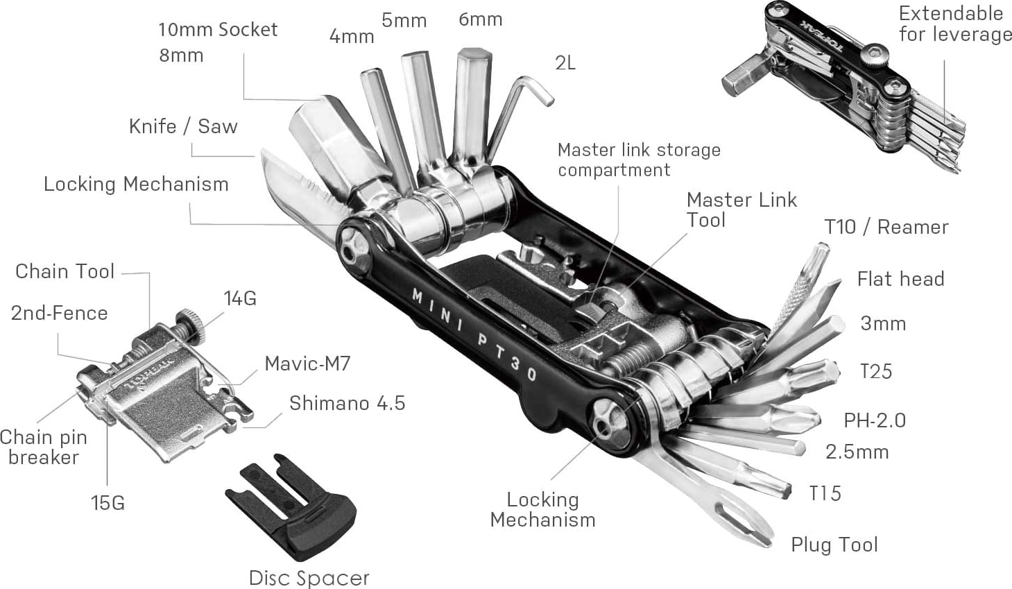 Держатель Topeak Ninja Cage Master+ Tollbox надежно удерживает флягу во время всей поездки, вне зависимости от её стиля и продолжительности. Особенностью флягодежателей серии Ninja является сменный "хвостивик" позволяющий стыковать держатель с различными аксессуарами одноимённой серии производителя. Такими как системы накачивая CO2, различные компактные наборы инструментов, контейнеры для запасных камер и т.д. Данный набор комплектуется стыкуемым мультулом Topeak Toolbox PT30, включающим в себя весь необходимый инструмент, требующийся для ремонта или настройки в пути.