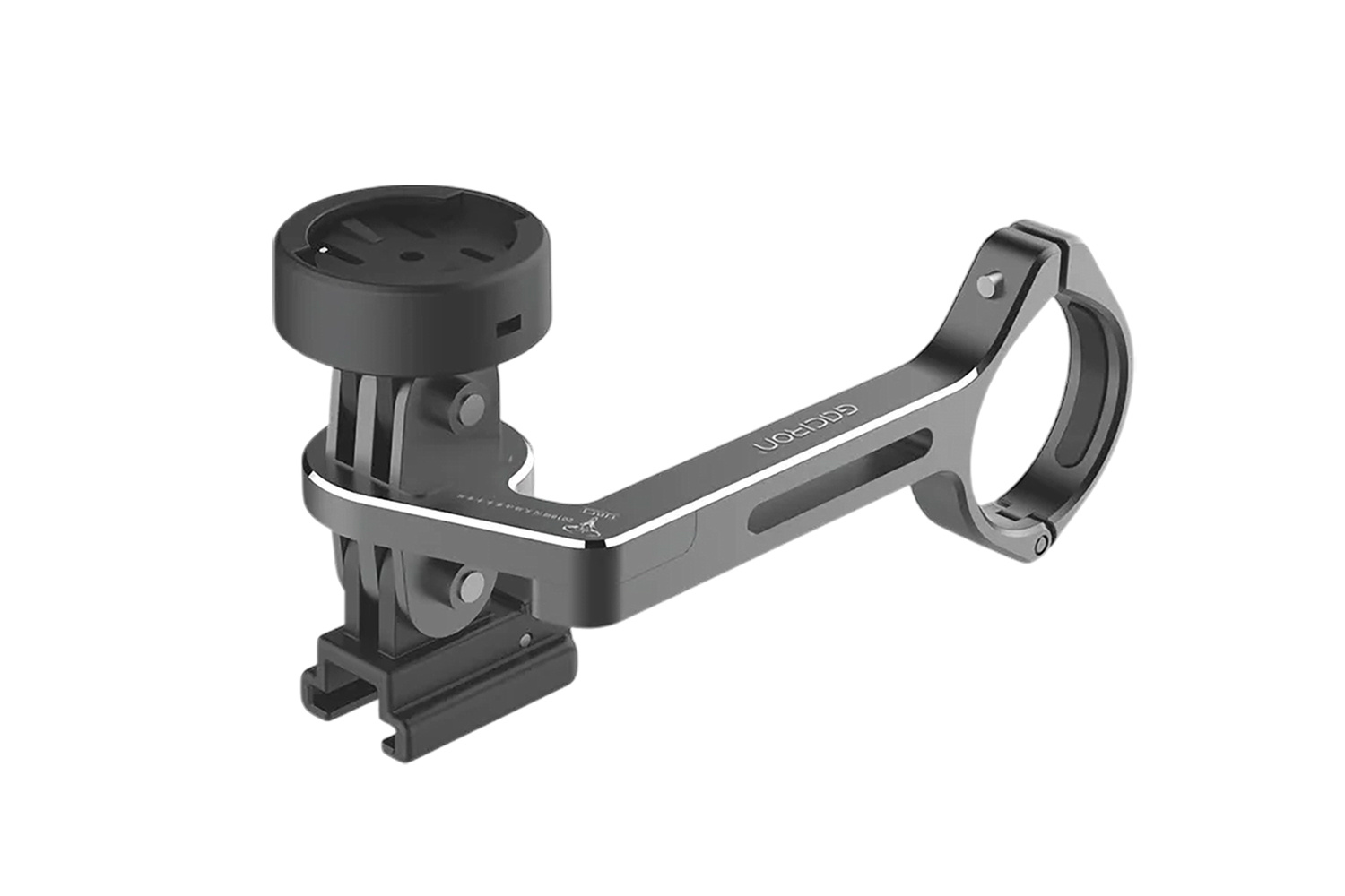Универсальный адаптер снаряжения на руль велосипеда. L-образный крепеж, выполненный из алюминиевого сплава 6061, может нести на себе велокомпьютер и экшн-камеру или фонарь со стандартом крепления GoPro. Крепления могут быть переставлены местами или заменены, а так же имеют угол регулировки в 100 градусов.