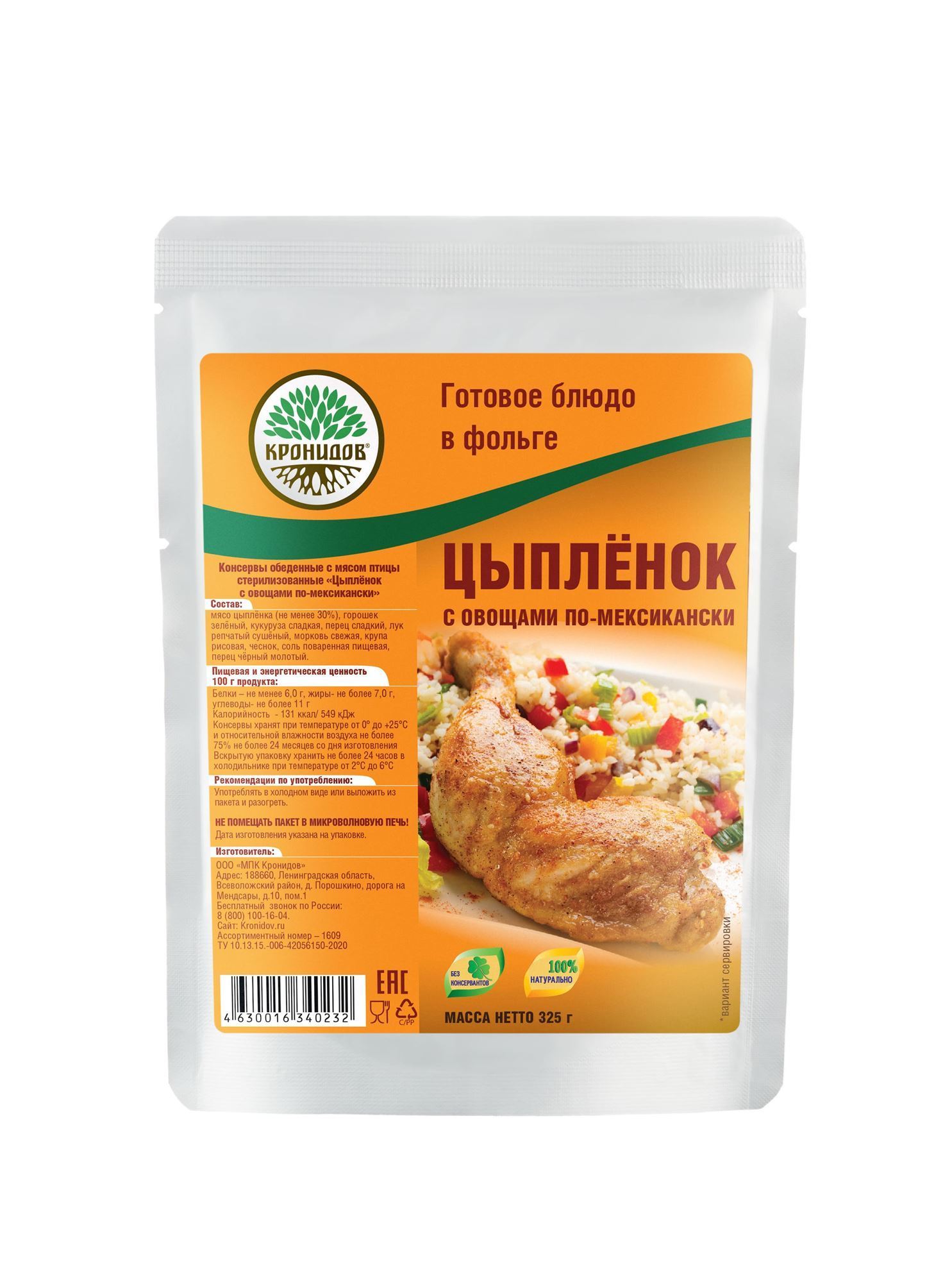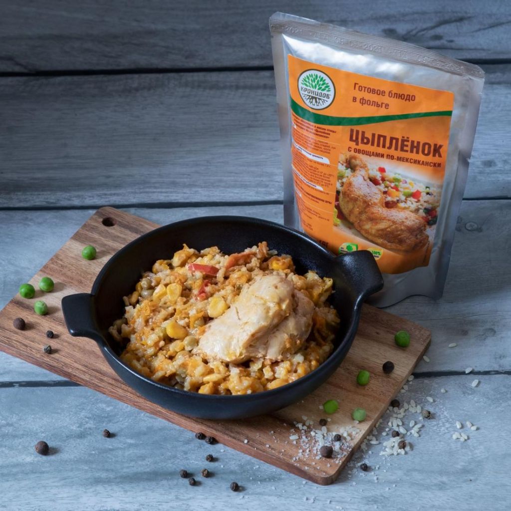 Состав: мясо цыпленка (филе), горошек зеленый, кукуруза сладкая, перец сладкий, лук репчатый сушёный, морковь свежая, крупа рисовая, чеснок, соль поваренная пищевая, перец черный молотый.