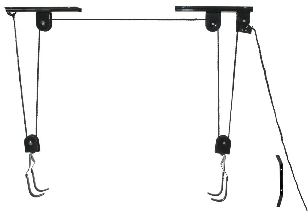 Альтернативный вариант системы хранения велосипеда ACME M-Wave Bike Lift. Представляет из себя конструкцию блоков с потолочным креплением, благодаря которым, велосипед может быть поднят на высоту до четырех метров. Все силовые элементы конструкции стальные, ролики пластиковые, трос нейлоновый.