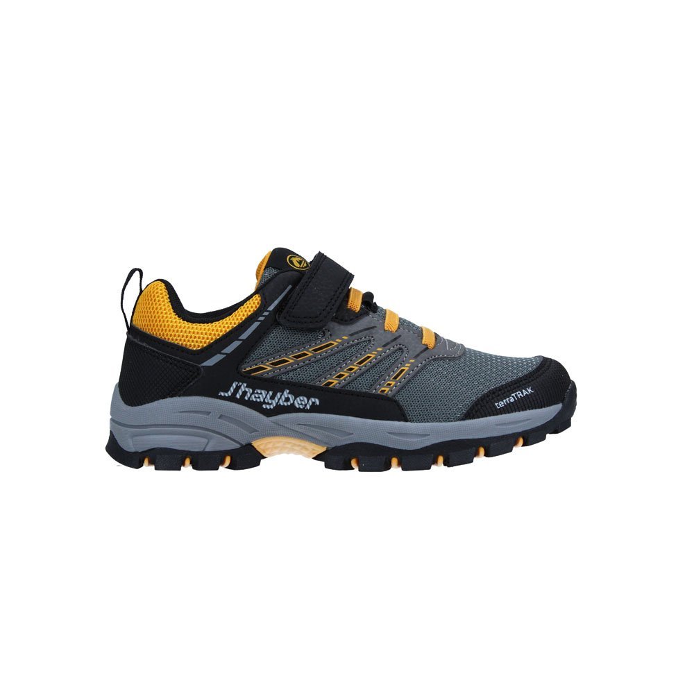 Кроссовки для бега для мальчиков серого цвета с горчично-желтыми вставками.