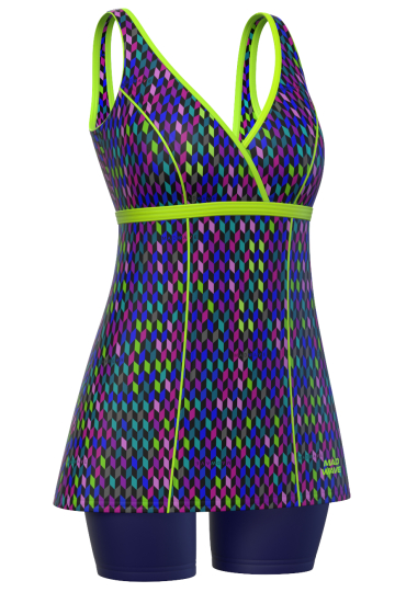 Моделирующий слитный купальник танкини Fluent Anti-chlor с шортиками до середины бедра обладает корректирующим эффектом. Благодаря специальному крою с юбкой и внутренней утягивающей сетке в области живота, он создаёт более подтянутый силуэт и скрывает проблемные зоны. Купальник подходит как для плавания в бассейне, так и для активного отдыха на пляже или в аквапарке.