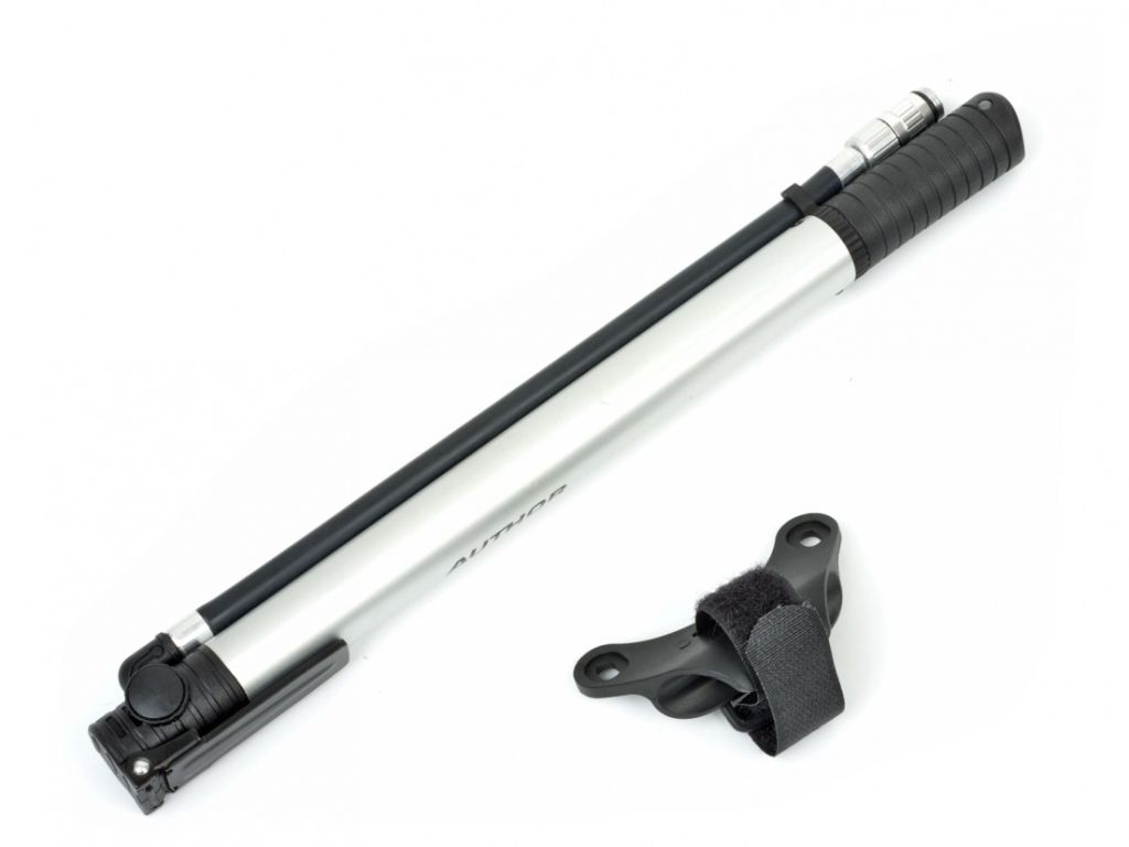 Портативный насос с механизмом накачивания повторяющим напольные насосы (есть упорная площадка и выносной шланг). Обладает Т-образной рукоятью и легким алюминиевым корпусом. Совместим со всеми типами ниппелей.
