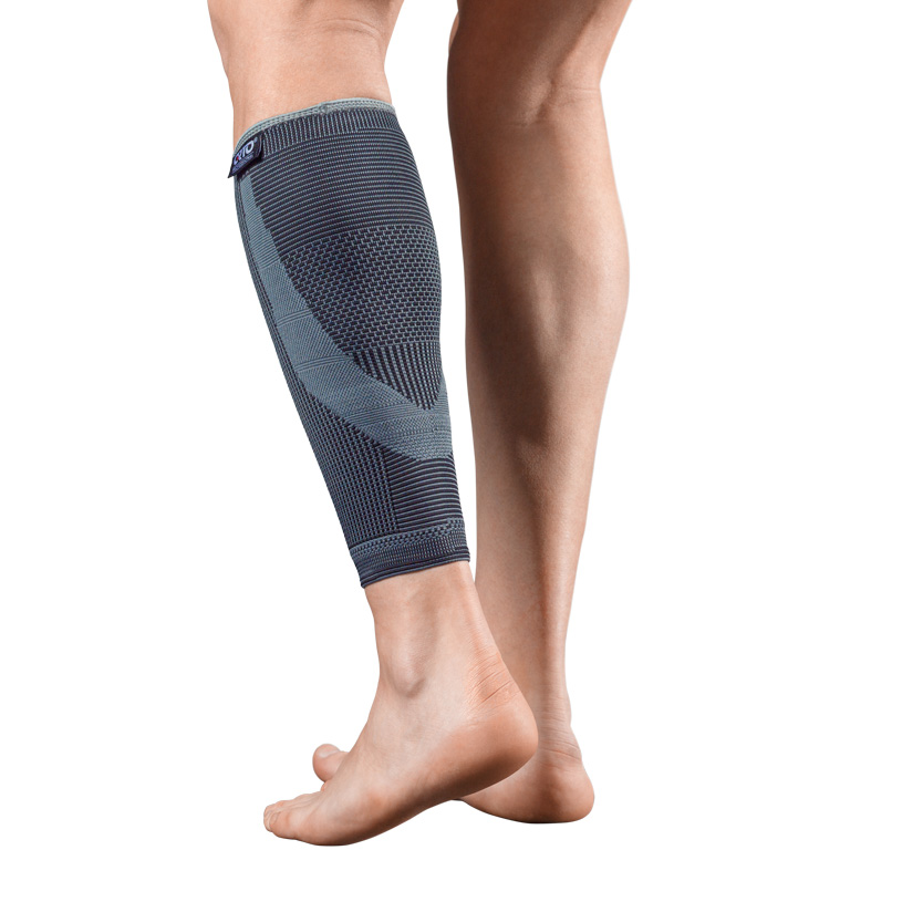 Трикотажный бандаж на голень с элементами динамического тейпирования: зонами разной эластичности в проекции трехглавой мышцы и ахиллова сухожилия. Имеет мягкий кант и симметричную основу анатомической формы.