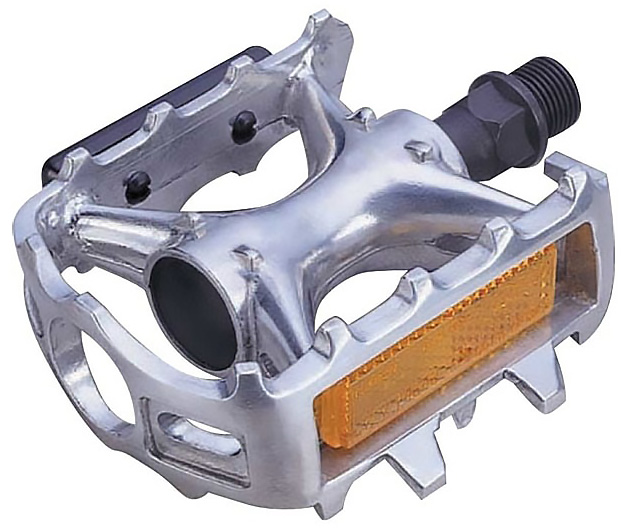 Надежные классические цельнолитые педали с торцевыми отражателями. Ось выполнена из хром-молибдена, подшипники насыпные.
