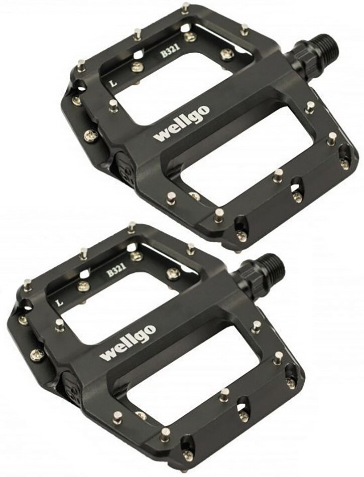 Широкие педали платформы Wellgo B-321DU. Легкий корпус из сплава магния и алюминия, сменные шипы, закрытые подшипники, полированная ось, возможность установки шестигранником. Заявленный вес комплекта 392 грамм.