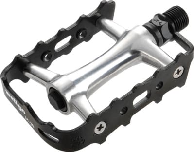 Классические цельнометаллические педали Wellgo M-20. Центральная часть корпуса вылита из алюминия, к ней крепится стальная рамка. Рамка оснащена отверстиями для монтажа туклипсов и катафот.
