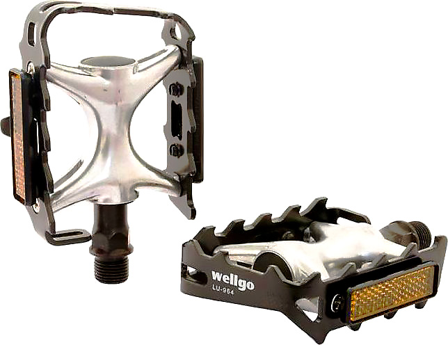Классические цельнометаллические педали Wellgo. Центральная часть корпуса вылита из алюминия, к ней крепится стальная рамка. Рамка оснащена отверстиями для монтажа туклипсов и катафот. Задняя часть рамки имеет специальный шип для удобства "ловли" педали с туклипсом ногой во время движения.