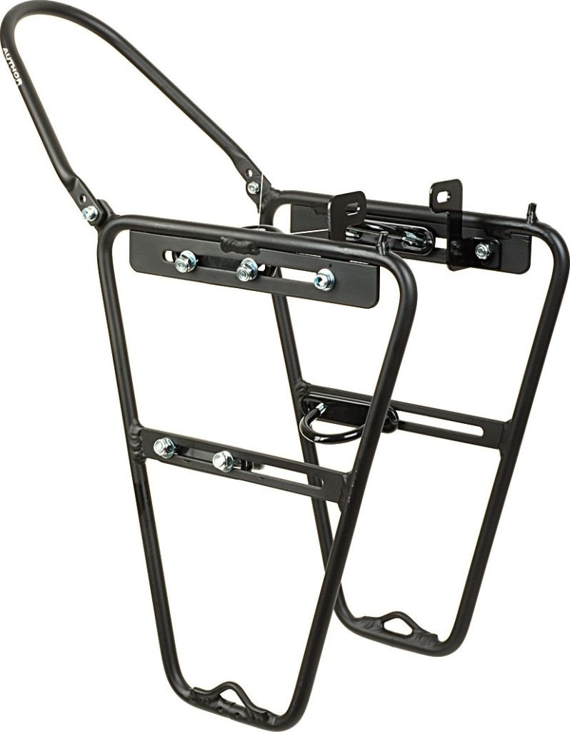 Передний туристический багажник Author. Выполнен из полых алюминиевых трубок, благодаря чему имеет невысокую массу. Крепеж к вилке велосипеда универсальный, при помощи комплектных скоб, а также к стойкам торомзов. Предназначен исключительно для перевозки боковых туристических сумок.