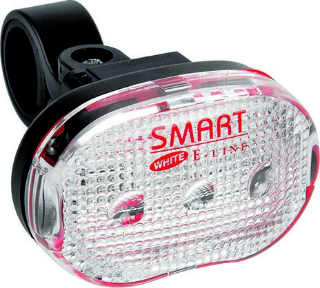 Передний сигнальный фонарь Smart E-Line. Обозначает велосипедиста на дороге светом яркого светодиода, питаемого от стандартных батареек, входящих в комплект поставки. Крепление к рулю производится при помощи хомута с проставками под различные диаметры, присутствует возможность изменения угла установки фонаря. Маячок работает в двух режимах свечения. Корпус оснащен влагозащитой для поездок под дождем.