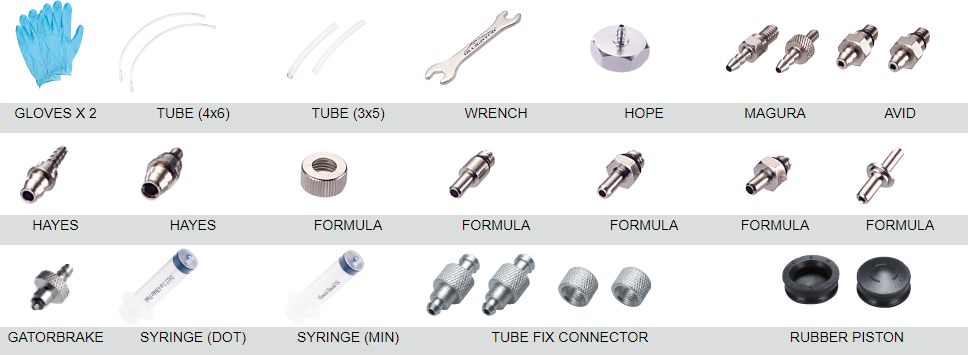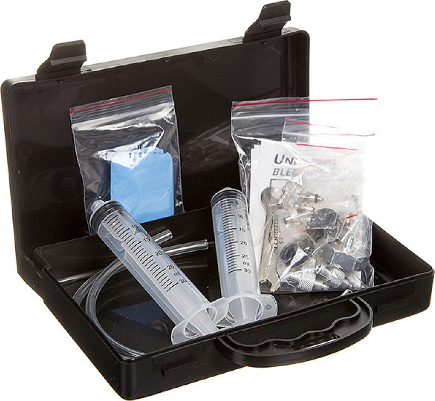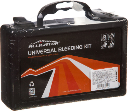 Универсальный набор для прокачки гидравлических тормозов ALLIGATOR HK-UBK001-TK. Набор оснащен всем необходимым для работы с тормозами от производителей Shimano, Tektro.