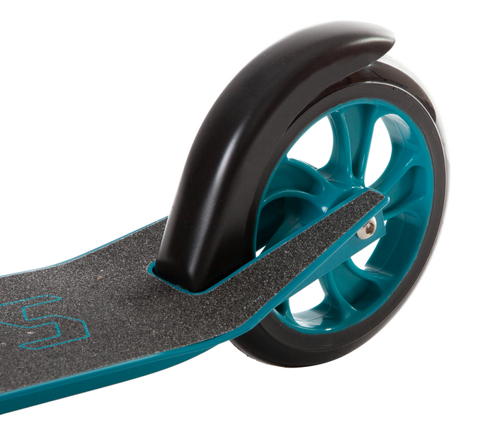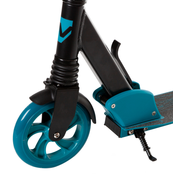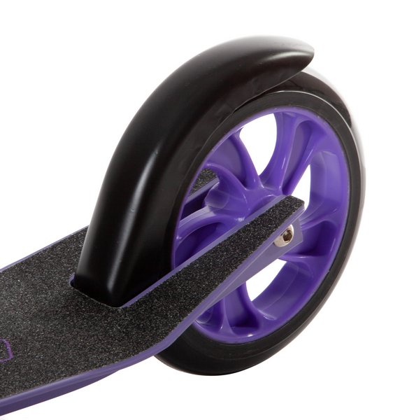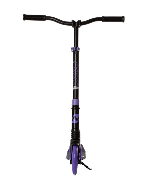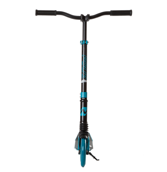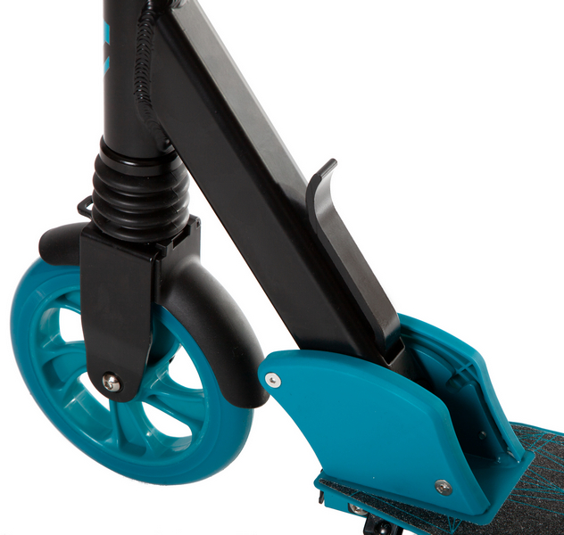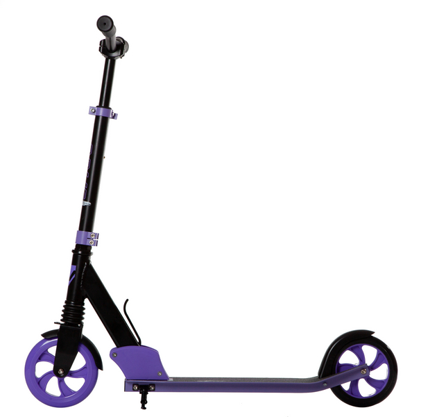 Особенности:Складной, передний амортизатор, антискользящая поверхность деки, регулируемый по высоте руль, задний ножной тормоз, PU колеса 160 мм, подшипники ABEC 7, подножка