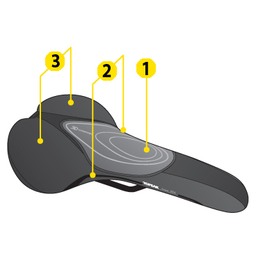 3D Comfort Built-in Triple-density Structure TPE-AirFoam-BaseFoam inside Compression Free Zone to Provide Maximum Comfort on the Bike