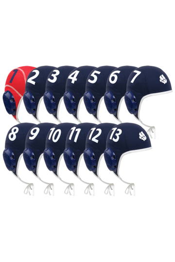 Комплект из 13 ватерпольных шапочек Waterpolo set 13 включает в себя 1 красную шапочку для вратаря и 12 шапочек для игроков.