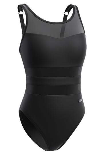 Горизонтальные полосы из полупрозрачной сетки подчёркивают талию и визуально вытягивают силуэт. Формованные поролоновые чашки и регулируемые бретели создают дополнительную поддержку в области груди. Полуоткрытая спина и высокий вырез бедра обеспечивают свободу движений и комфорт во время плавания