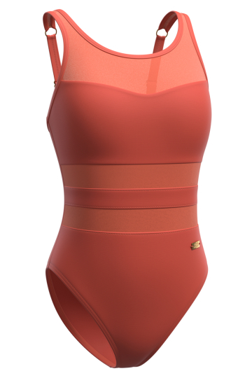 Горизонтальные полосы из полупрозрачной сетки подчёркивают талию и визуально вытягивают силуэт. Формованные поролоновые чашки и регулируемые бретели создают дополнительную поддержку в области груди. Полуоткрытая спина и высокий вырез бедра обеспечивают свободу движений и комфорт во время плавания