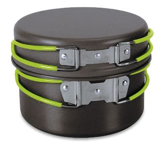 Два котелка с двумя крышками также служат в качестве сковороды. Комплект посуды PINGUIN Quadri выполнен из алюминия с анодированной поверхностью. Складные ручки выполнены из стальной проволоки, снабженной силиконовой жаропрочной рубашкой.