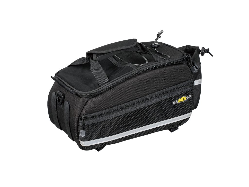 Жесткая, устойчивая к непогоде сумка на багажник. Разделяемый основной отдел, боковые сетчатае карманы, вынесенный назад держатель бутылки, устанавливается на багажник с помощью липучек.