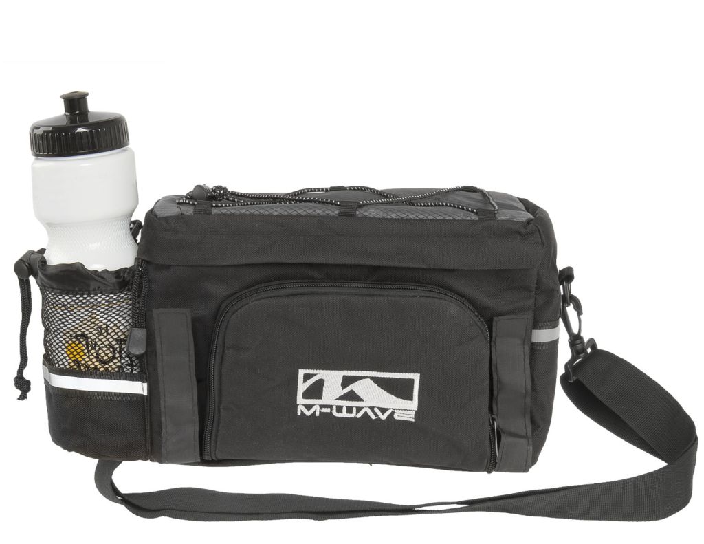 Сумка на багажник велосипеда с объемом, расширяемым за счет раскладных боковых карманов. Сумка оснащена отделениями для фляг и наплечным ремнем для переноски. В верхней части имеется утяжка, по периметру вшиты светоотражающие вставки для повышения заметности на дороге.