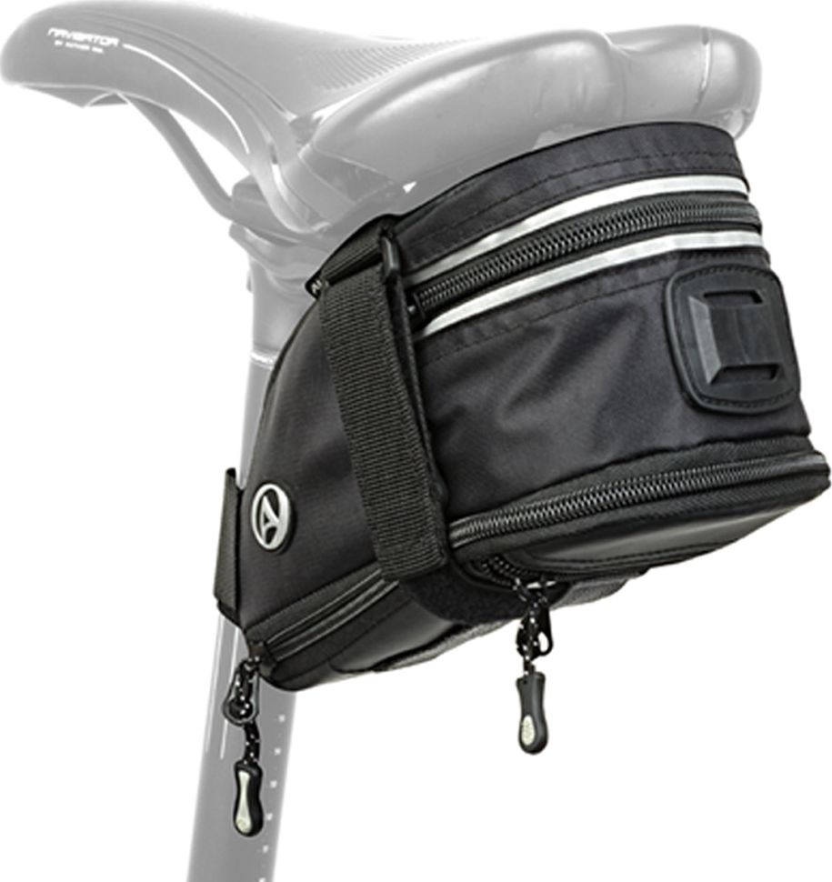 Компактная подседельная сумка Author A-S188TPN X72. Обладает универсальным способом крепления к рамкам седла и подседельному штырю - на стрепах. Благодаря своей конструкции, объем сумки может быть расширен, практически, вдвое за считанные секунды. Снизу расположен дополнительный карман, сзади имеется платформа для установки фонаря.