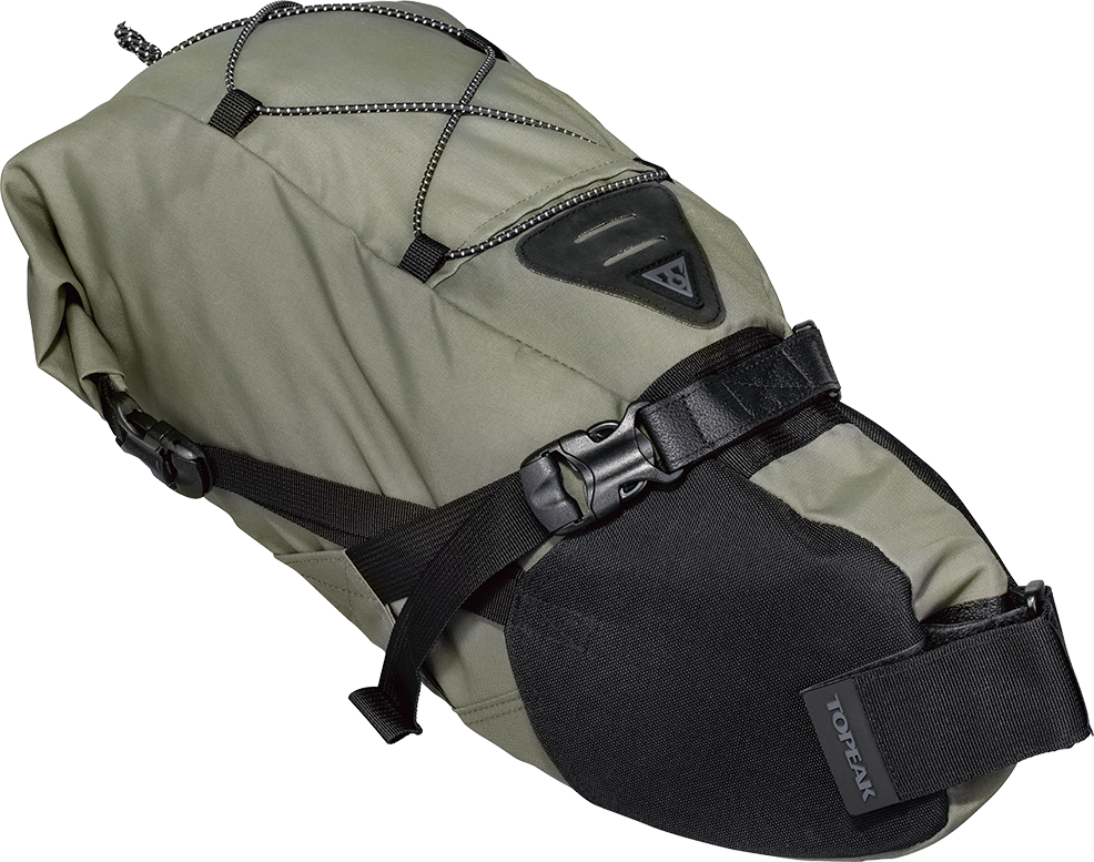 Высококачественный продукт для легковесного туризма от Topeak. Представляет из себя альтернативу громоздким багажникам и сумкам типа "штаны". Оснащена несколькими утяжками для создания общей жесткости конструкции. Имеет обновленную систему фиксации к рамкам седла, предотвращающую раскачивание сумки во время педалирования. Обладает высокой износостойкостью, влагозащита обеспечивается качеством материалов и внутренним герметичным чехлом со встроенным воздушным клапаном для стравливания лишнего воздуха. В задней части имеется крепления фонарей безопасности. Совместима практически со всеми горными и шоссейными велосипедами.