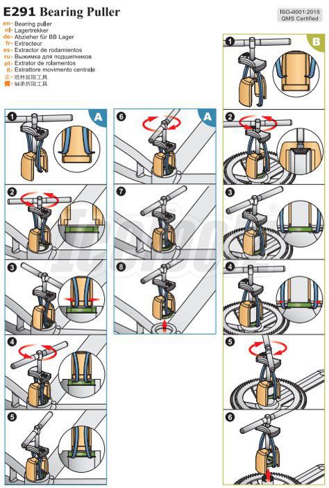 Запатентованный компанией IceToolz инструмент для демонтажа подшипников системы - незаменимый инструмент в мастерской. С его помощью можно не только извлечь обычные промподшипники из рамы, но и снять подшипник системы Campagnolo® Ultra-torque с вала или извлечь отдельно подшипник из картриджа, что позволить сэкономить деньги. В целом, этот инструмент может быть использован на всех каретках с внешним диаметром до 45 мм, однако стоит быть осторожным с карбоновыми рамами, особенно с алюминиевыми вставками.