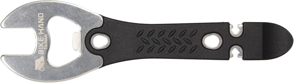 Педальный ключ с обрезиненной рукояткой. В качестве дополнительных функций выступают спицевые ключи, монтажка и открывашка для бутылок.