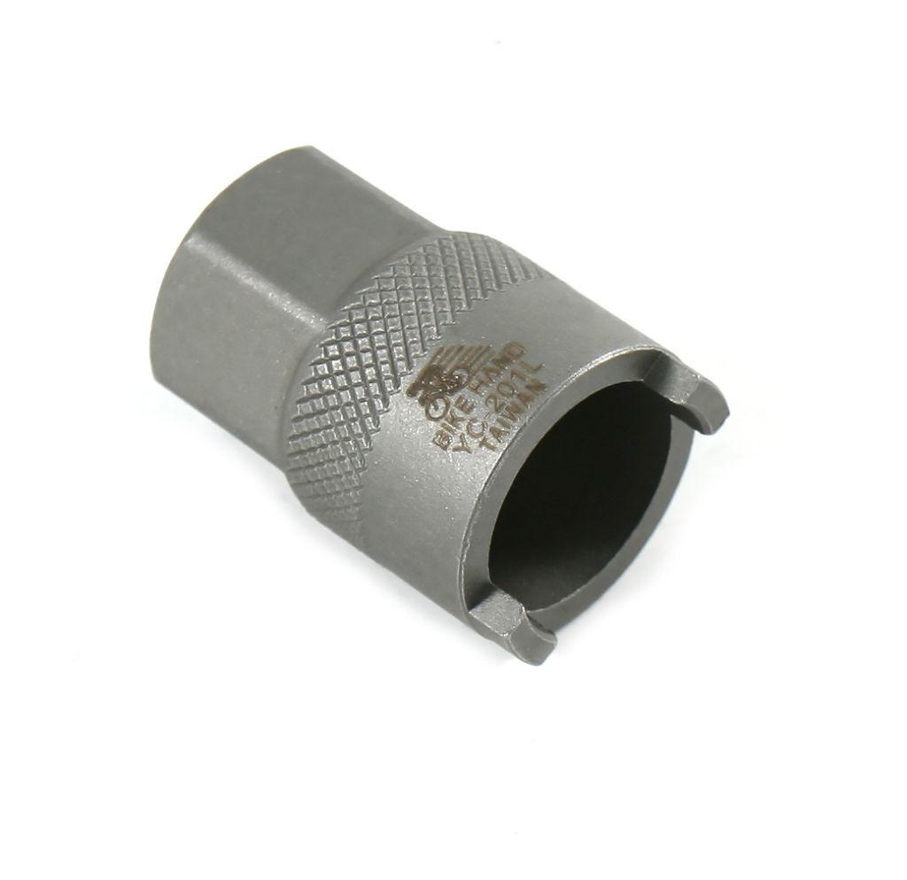 Съемник двухшлицевых BMX трещоток BikeHand YC-201L. Выполнен из стали, с обратной стороны имеет квадратное крепление для воротка и рожкового ключа на 21 мм.