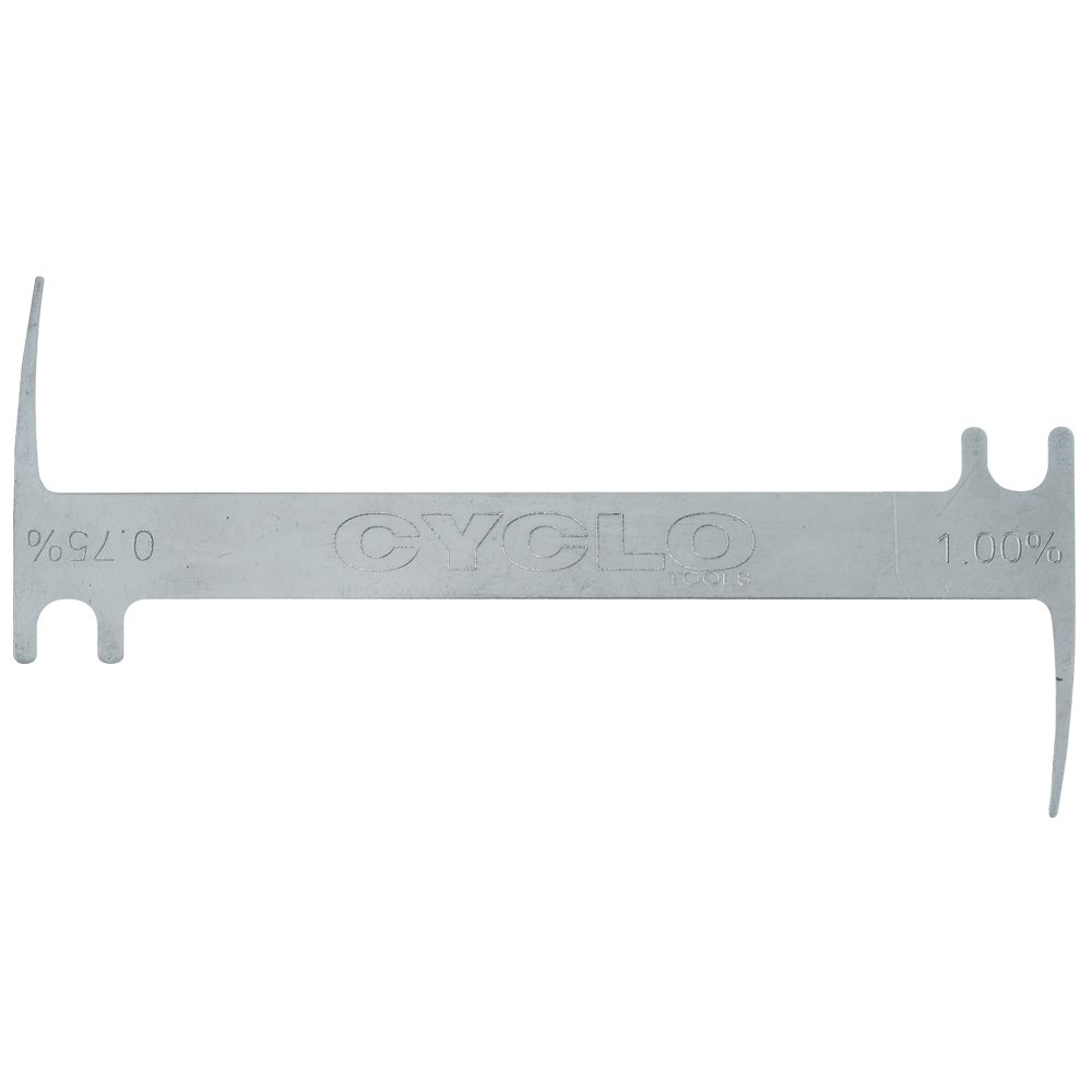 Аксессуар для велолюбителя и незаменимый помощник на верстаке профессионального механика. Универсальный калибр для определения степени износа цепи. Один конец фиксируется в звене, второй является индикатором общего износа. Если удлиненный конец проходит сквозь звенья, цепь пора скоро менять или она уже подлежит замене. 1 конец показывает растяжение цепи на 0,75% , второй на - 1%. Инструментальная сталь.