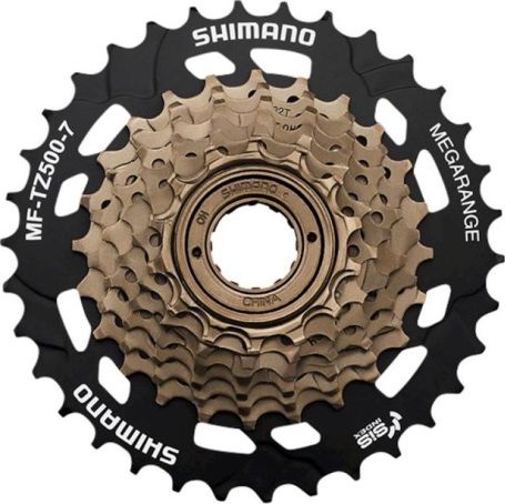 Современная многоскоростная трещотка от Shimano для трансмиссий на 7 передач. Под стандартную резьбу и стандартный съемник Shimano type. Модификация оснащения жесткой интегрированной защитой предотвращающей сваливание цепи за пределы рабочего диапазона - после установки этой модификации можно снять протектор устанавливаемый на спицы колеса.