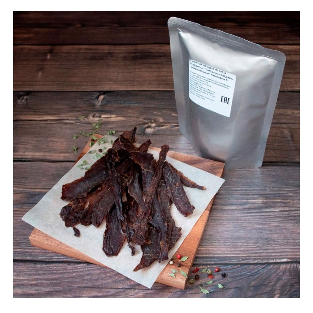 говядина, соль нитритная, декстроза, натуральные специи и их экстракты (перец красный, мускатный орех, кардамон, чеснок, паприка) усилители вкуса и аромата (Е621,), соль поваренная, регулятор кислотности Е575, ароматизатор (дым), сахар.