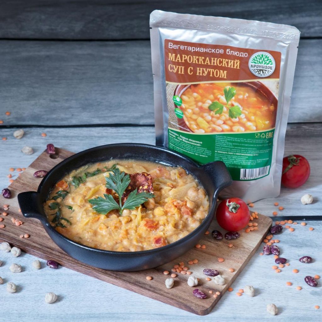 Вегетарианская версия марокканского супа Харира с нутом, чечевицей, фасолью, свежими помидорами, сельдерем, сушеными овощами и добавлением традиционной для Марокко специи зира в нашей мягкой фольгированой реторт-упаковке.