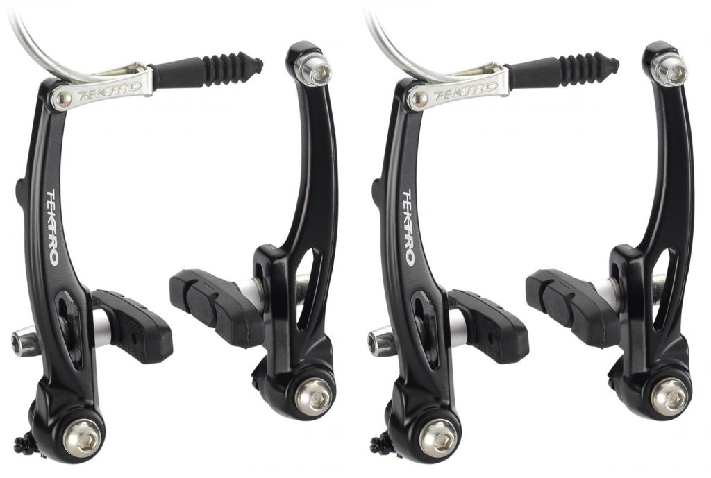 Полный установочный комплект V-Brake тормозов Tektro 855AL. Рычаги тормозов выполнены методом холодной ковки из алюминия. В них впрессованы латунные втулки скольжения для более плавной модуляции торможения. Комплектуются направляющими тросов, крепежными болтами и тормозными колодками со всепогодным компаундом.