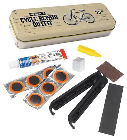 Набор заплаток Weldtite с дизайном, приуроченным к 75-и летию компании. Включает в себя шесть круглых заплаток для камер, крупную заплатку для покрышек, пару монтировок, клей, шкурку, мелок и карандаш для обозначения места прокола. Все содержимое упаковано в аккуратный металлический кейс.