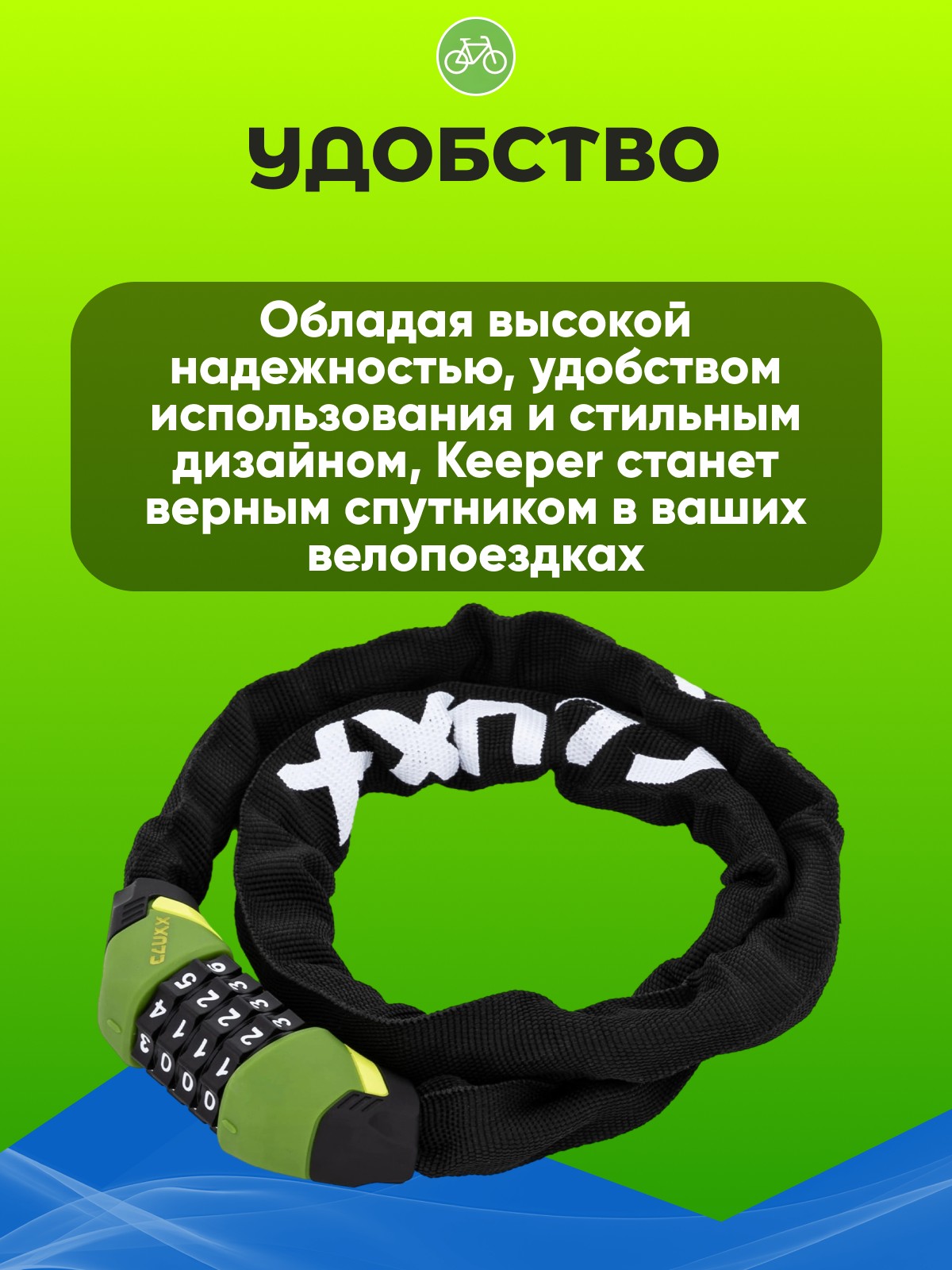 CLUXX Keeper 85C 5x850мм - надежный кодовый велозамок. Код с 4-значной настраиваемой комбинацией. Цепь выполнена из закаленной стали и титана, и обвита текстильной оболочкой, чтобы не повредить велосипед. Steel Ball Combo - система защелкивания со стальным шариком, устойчива к взлому и выдергиванию. Длина троса: 85см.