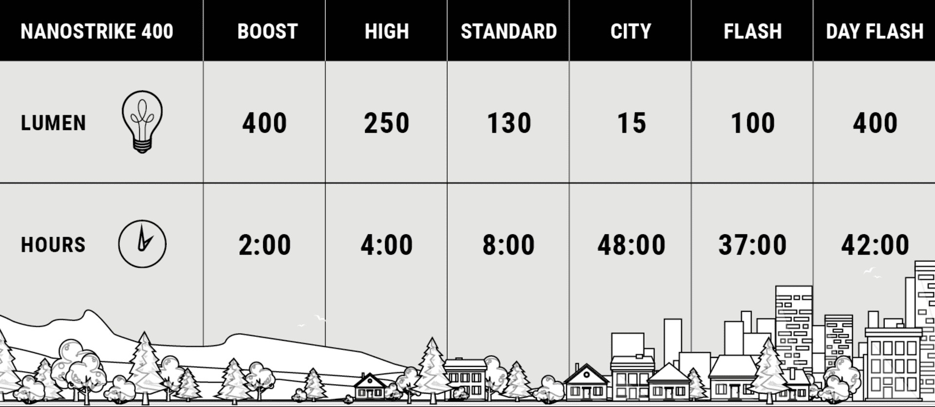 - 6 режимов работы (Boost, Городской, Дневной стробоскоп, Стробоскоп, Высокий, Стандарт)