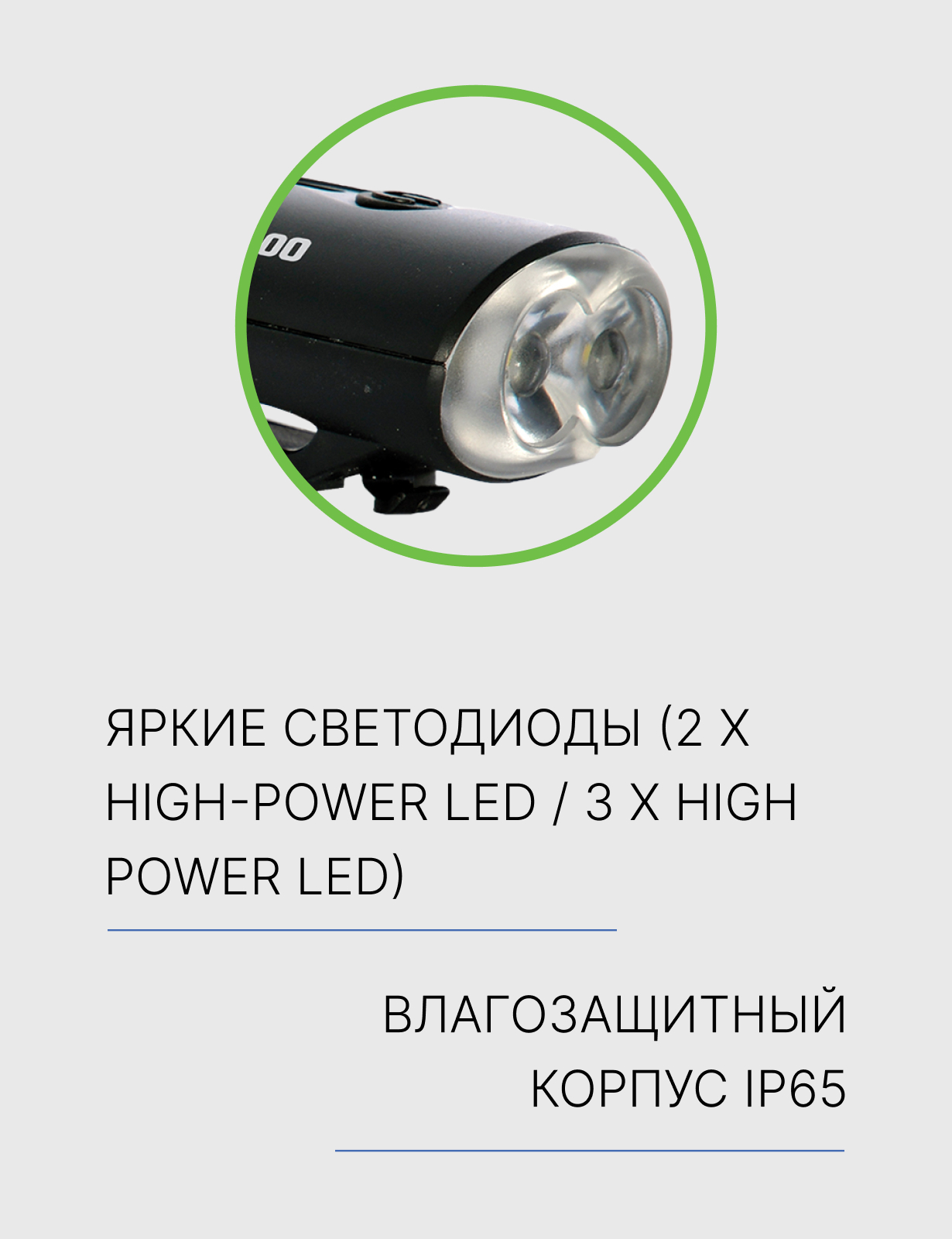 Особенности:Комплект (передний / задний), яркие светодиоды (2 x high-power LED / 3 x high power LED), световой поток 100 / 15 люмен, индикация низкого заряда батареи, влагозащитный корпус IP65, зарядка от USB (кабель Micro-USB в комплекте)