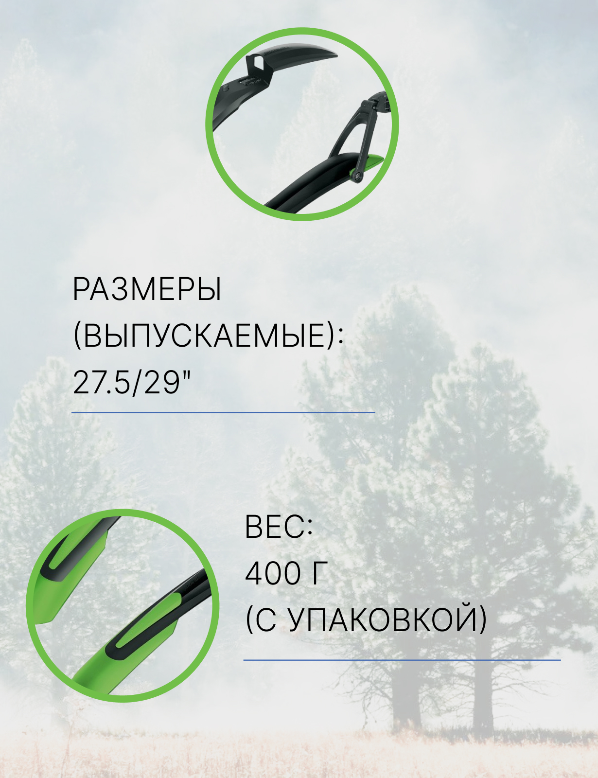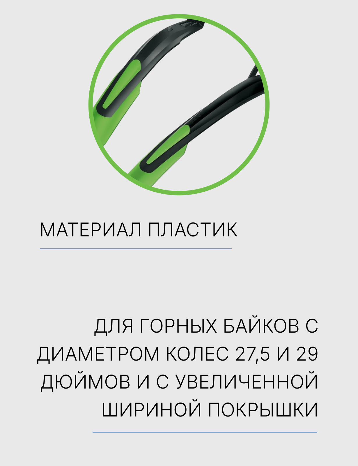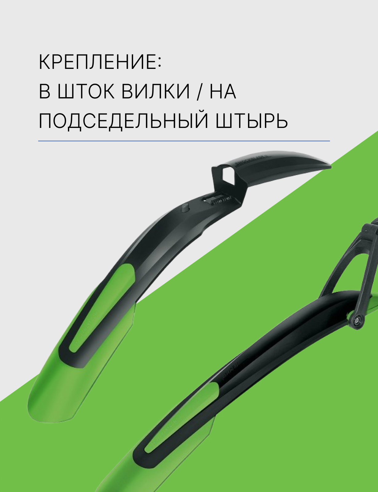 Комплект крыльев SKS Blade Plus разработан специально для горных байков с диаметром колес 27,5 и 29 дюймов и с увеличенной шириной покрышки. Крылья выполнены из качественного пластика с мягкими брызговиками на концах. Переднее крепится в шток вилки (в комплекте дополнительные адаптеры), заднее - за подседельный штырь. Вес комплекта с упаковкой - 400 грамм. Цвет: черный/зеленый.