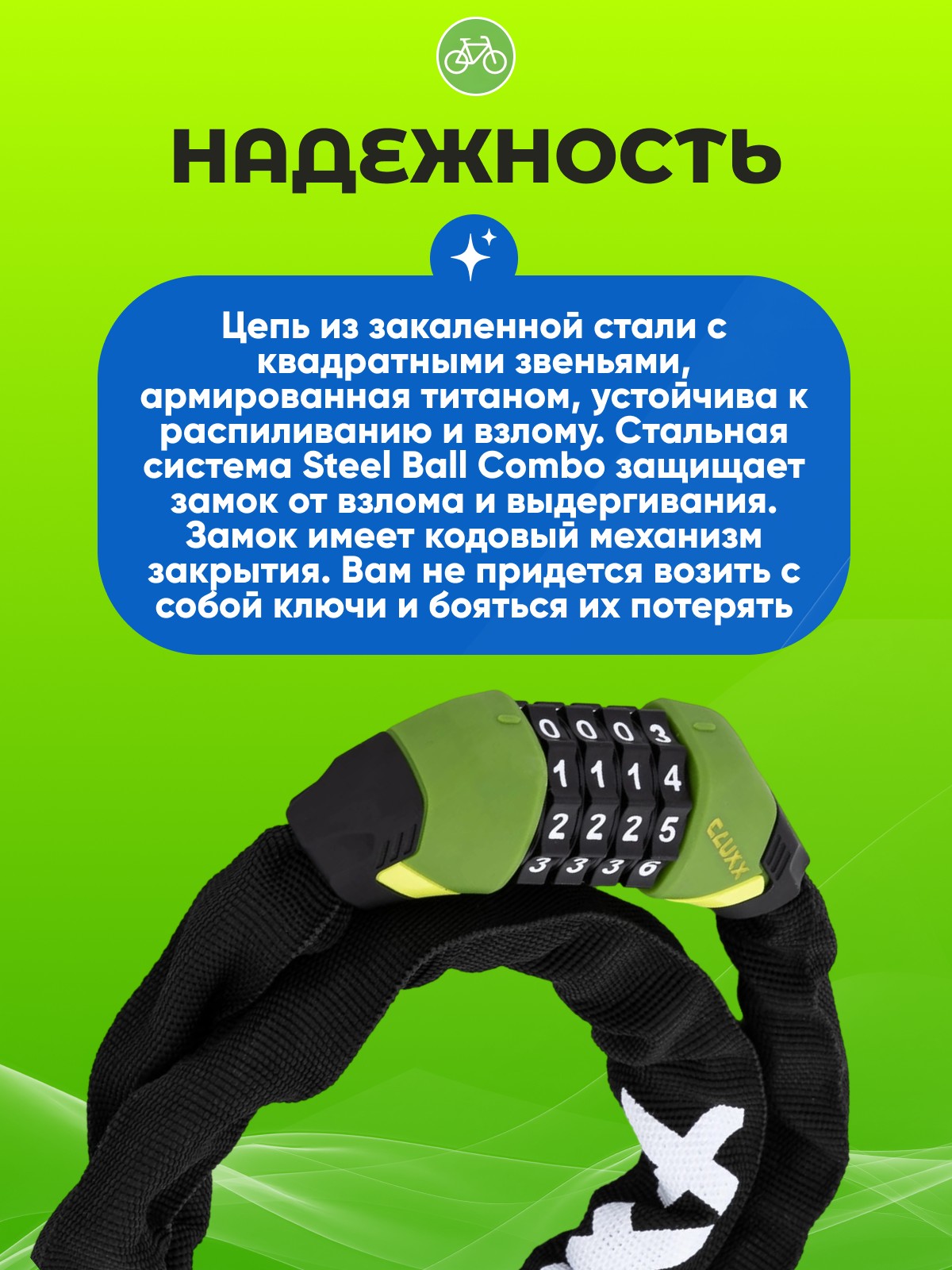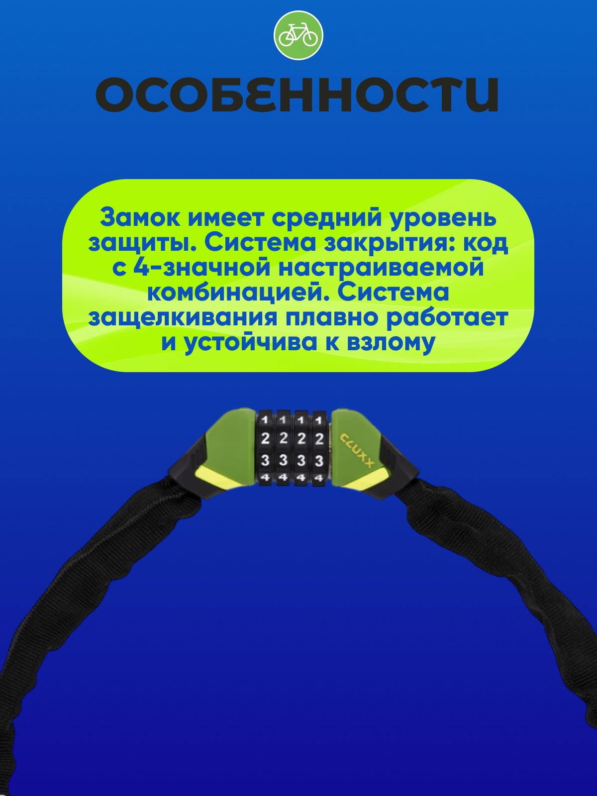 CLUXX Keeper 85C 5x850мм - надежный кодовый велозамок. Код с 4-значной настраиваемой комбинацией. Цепь выполнена из закаленной стали и титана, и обвита текстильной оболочкой, чтобы не повредить велосипед. Steel Ball Combo - система защелкивания со стальным шариком, устойчива к взлому и выдергиванию. Длина троса: 85см.