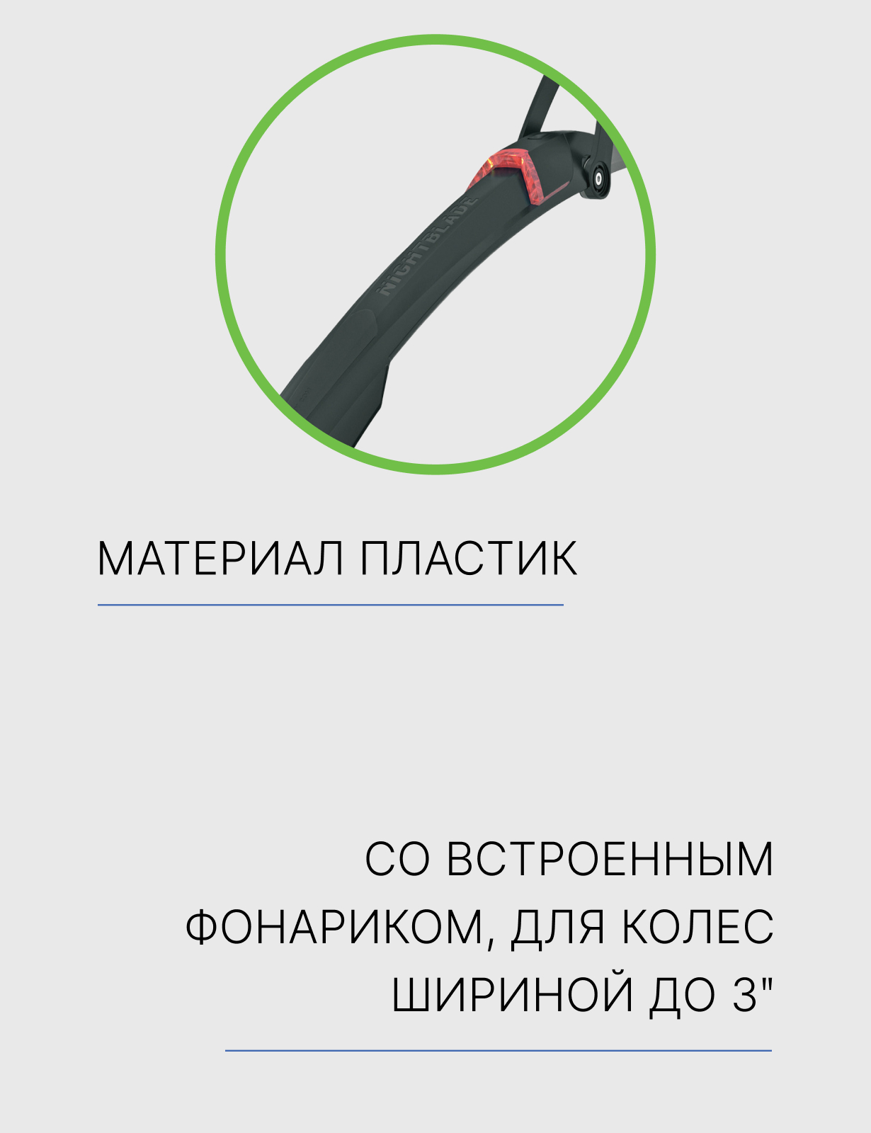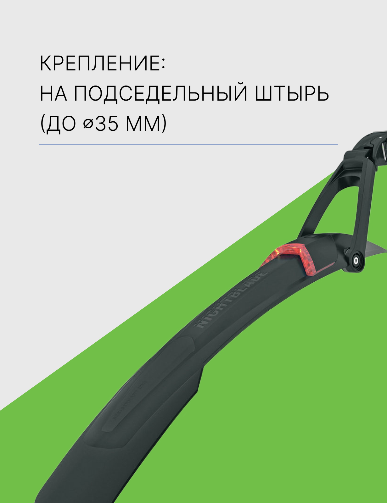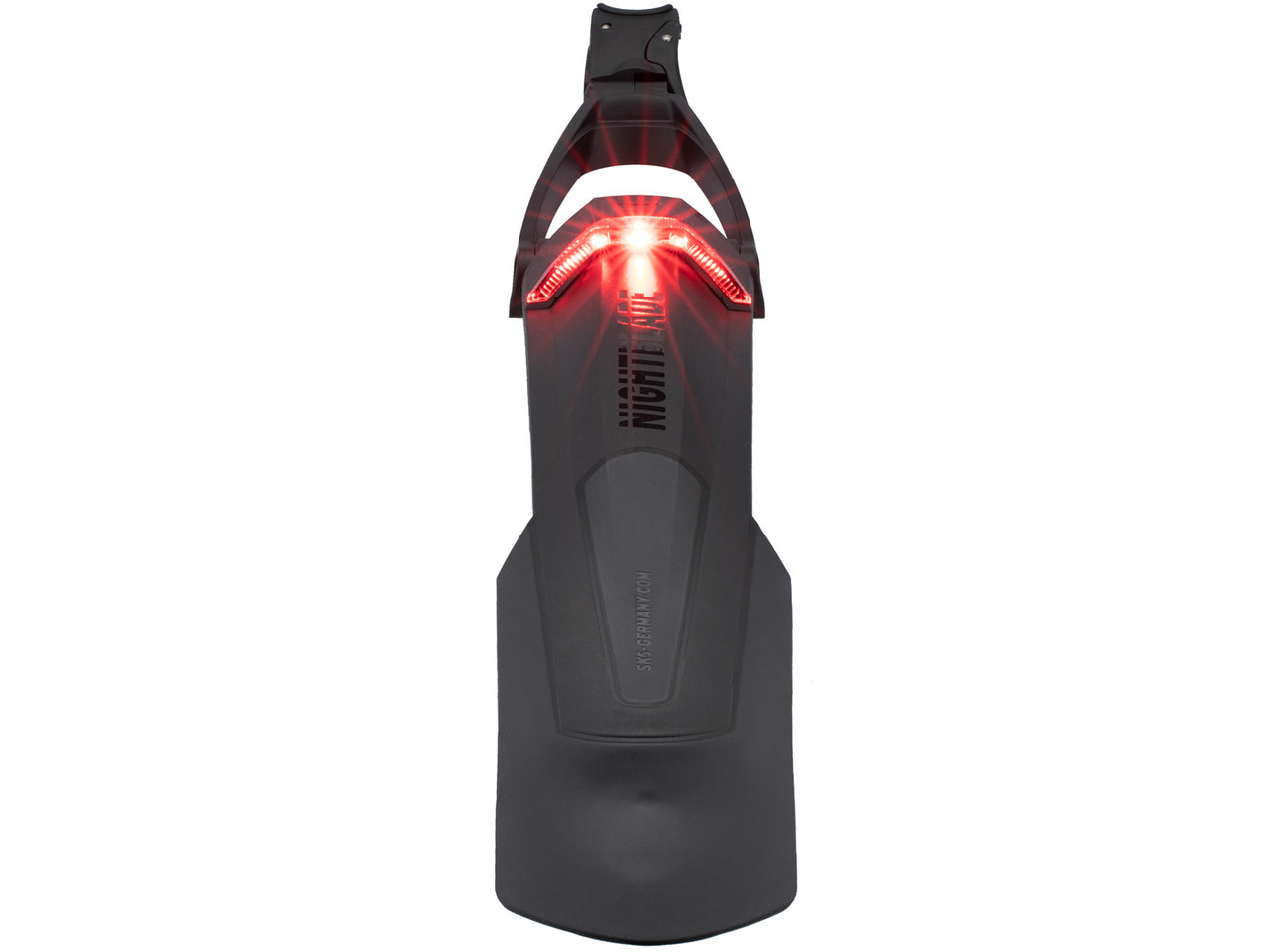 Заднее крыло SKS Nightblade имеет уникальную конструкцию со встроенным габаритным фонариком (время работы 7 часов, зарядка 1 час). Разработано для горных велосипедов с диаметром колес 27,5-29ʺ и широкими покрышками (полуфэтбайки). Крепится на подседельный штырь диаметром до 35 мм с помощью быстросъемного ремешка. Изготовлено из прочного пластика черного цвета. Длина крыла - 620 мм. Вес - 280 грамм.