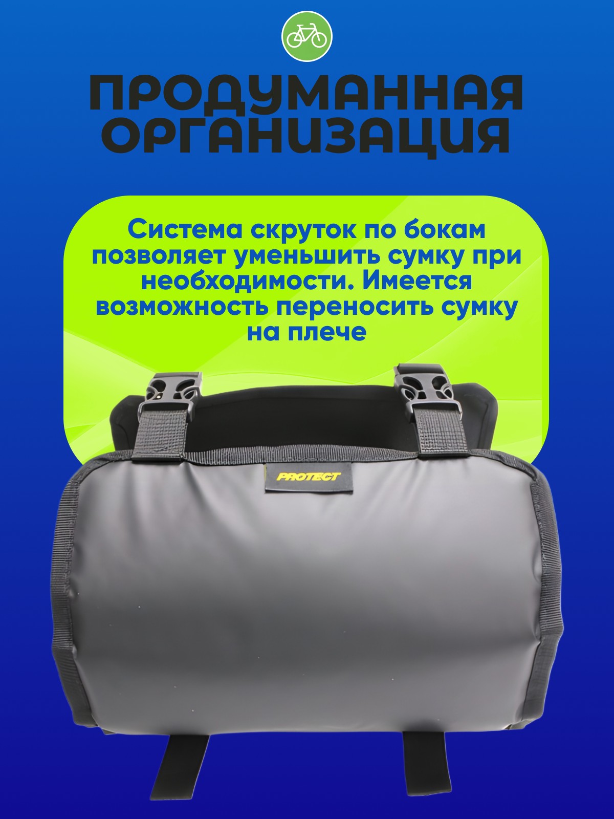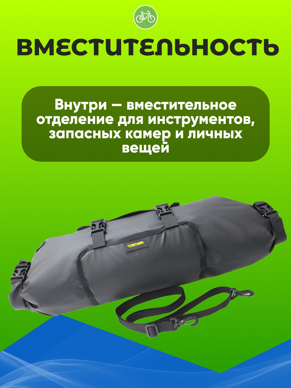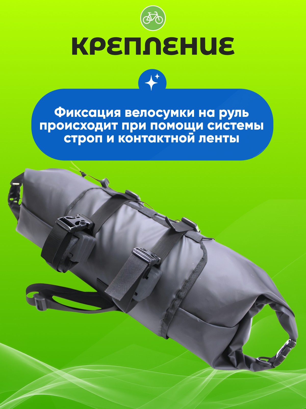Велосумка на руль до 12 л, Bikepacking (555-671) - вместительная велосумка от китайского бренда. Крепится на руль, водонепроницаемая, плотность ПВХ материала 450D. Фиксация велосумки на руль происходит при помощи системы строп и контактной ленты. Система скруток по бокам позволяет уменьшить сумку при необходимости. Имеется возможность переносить сумку на плече.