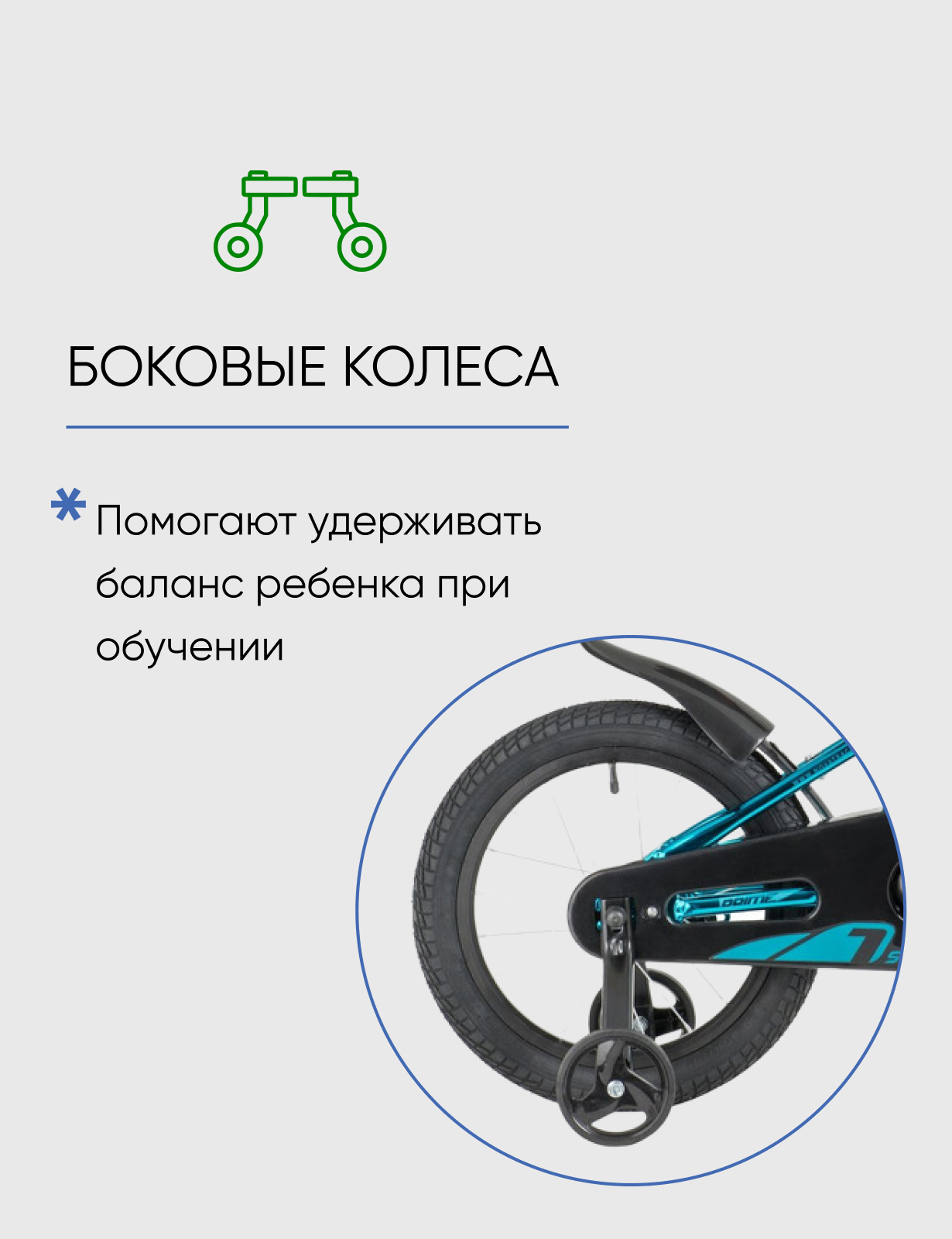Особенности велосипеда: Алюминиевая рама, Боковые колеса, Защита цепи, Звонок, Катафоты, Крепления для боковых колес, Крылья, Ножной тормоз, Широкое седло.