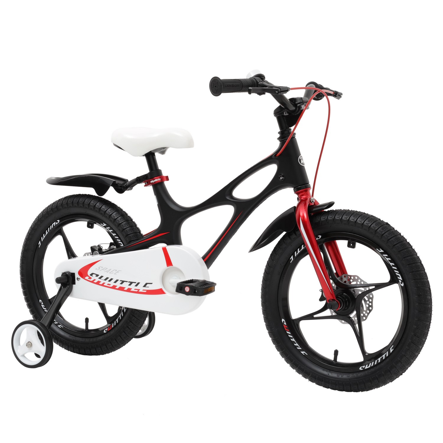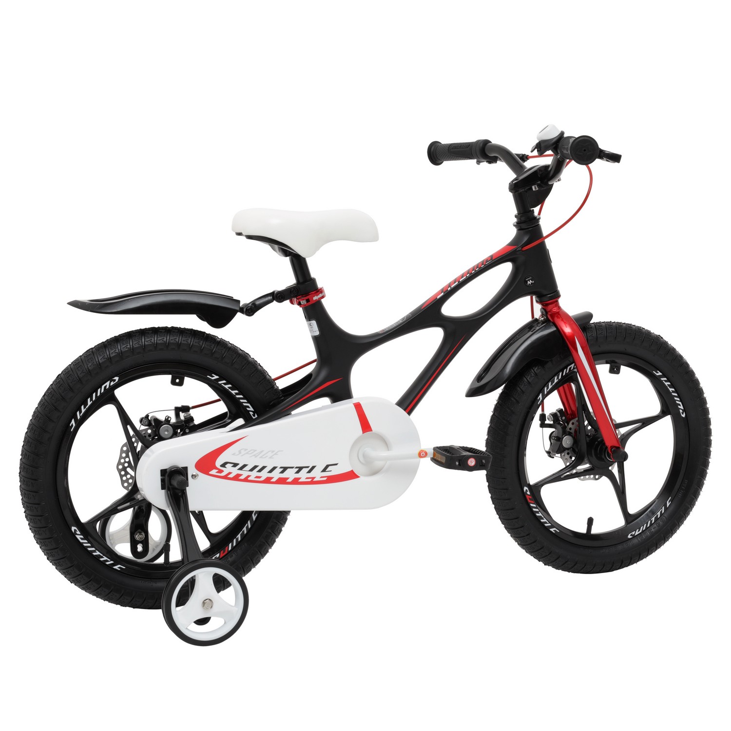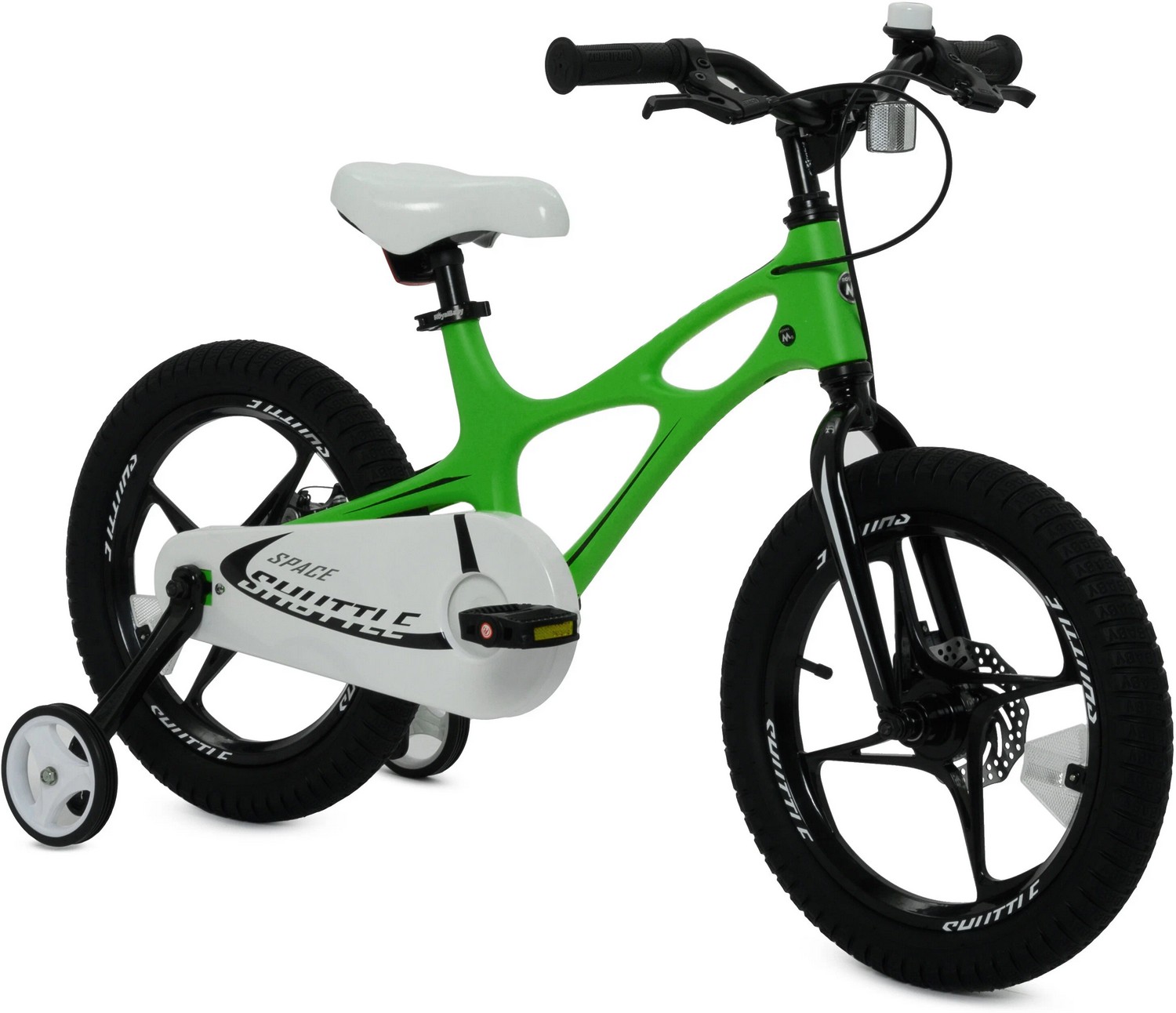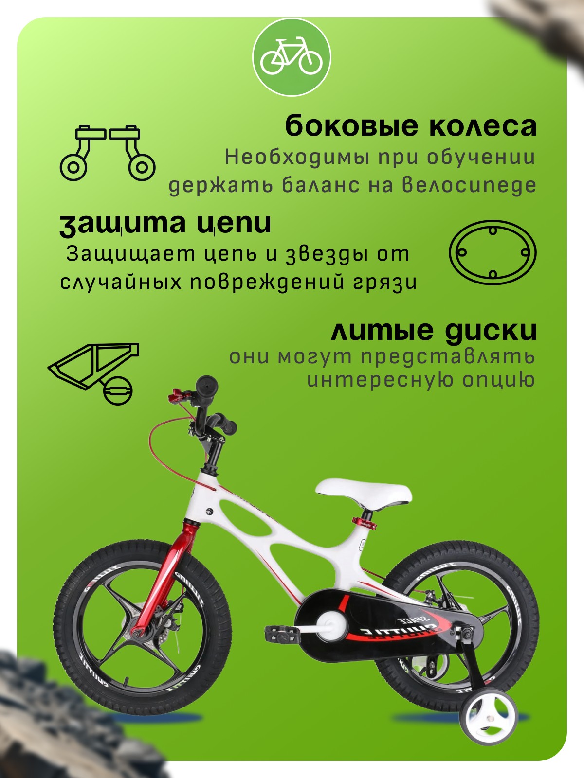 Особенности велосипеда: Боковые колеса, Дисковые тормоза, Защита цепи, Звонок, Катафоты, Крепления для боковых колес, Литые диски.