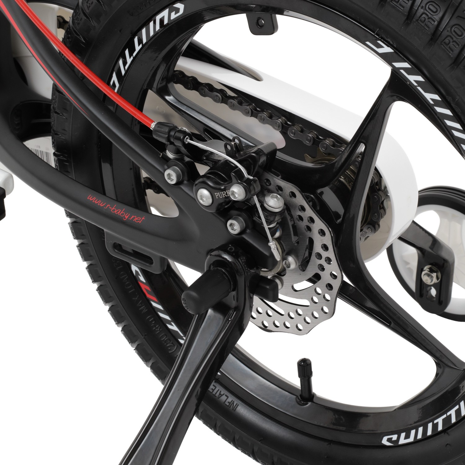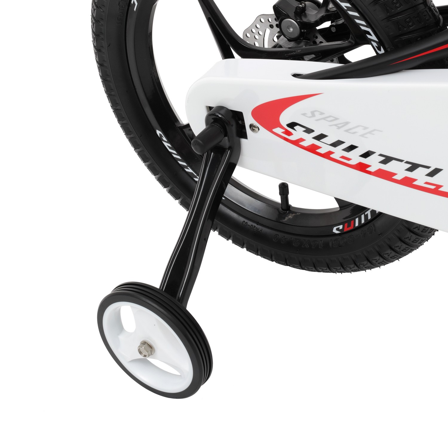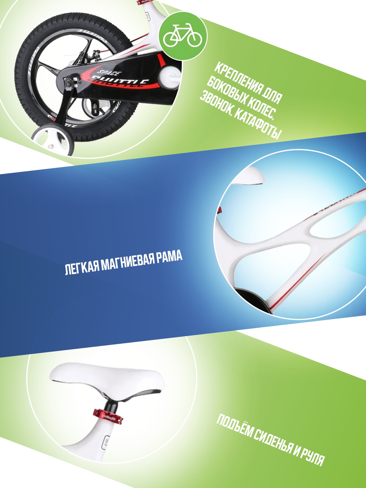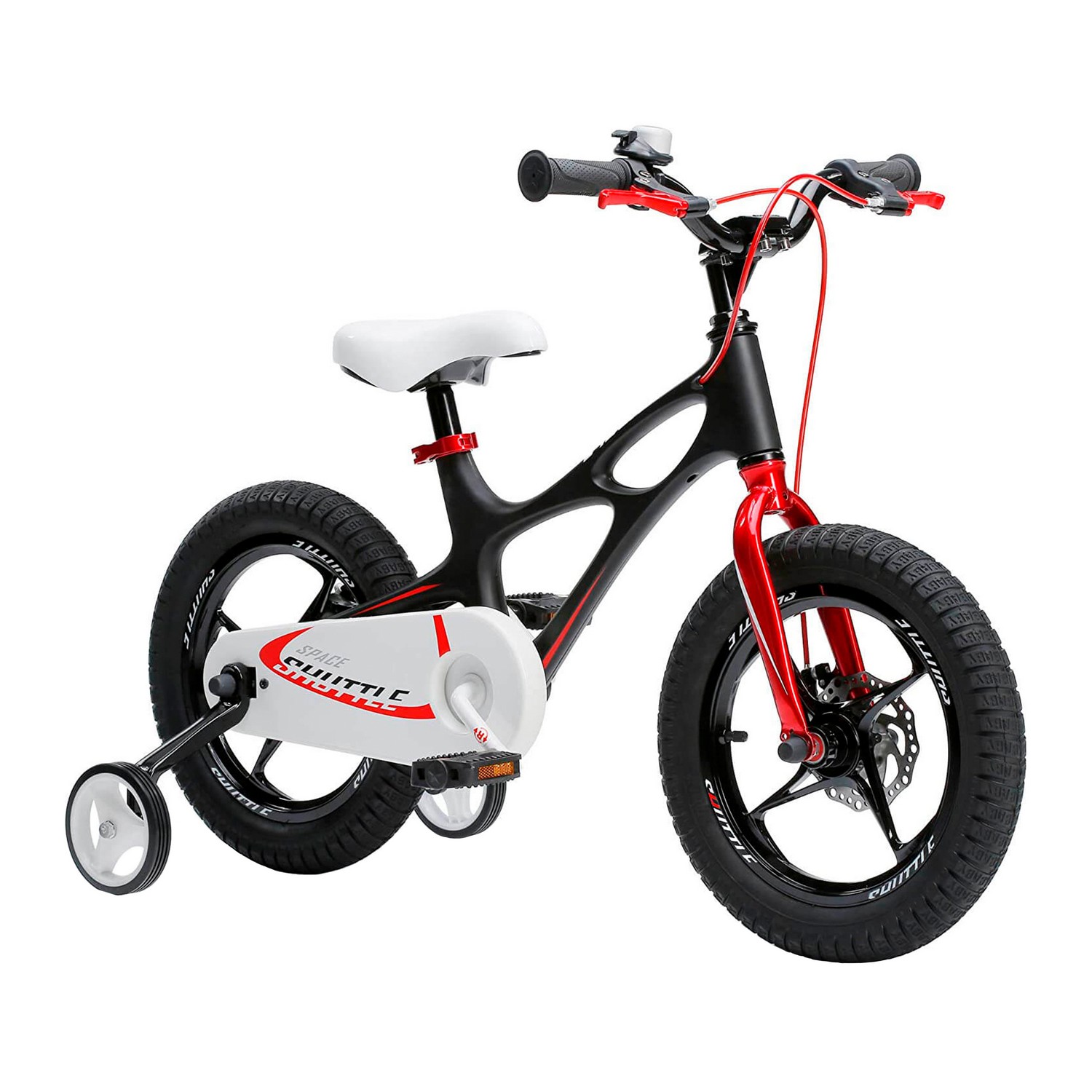 Особенности велосипеда: Боковые колеса, Дисковые тормоза, Защита цепи, Звонок, Катафоты, Крепления для боковых колес, Литые диски.