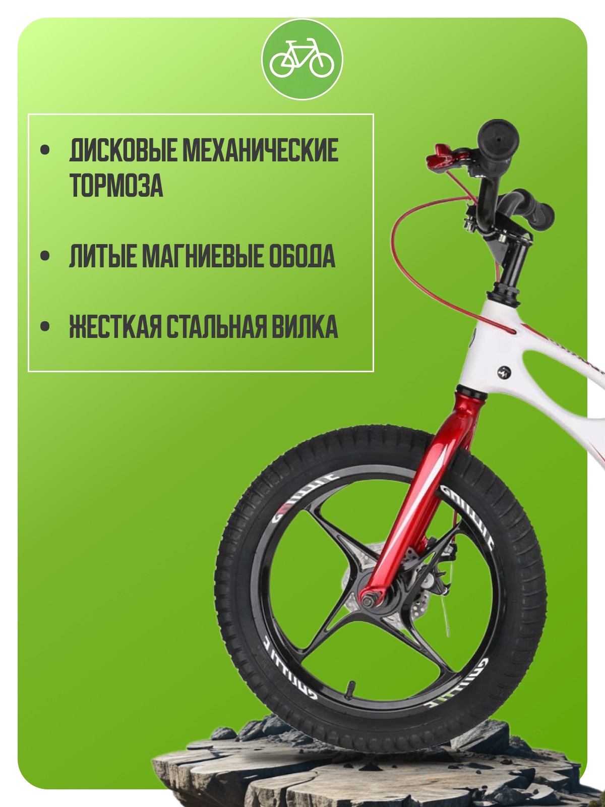 Велосипед, предназначенный для детей в возрасте от трех до шести лет, без переключения передач. Технические особенности: легкая магниевая рама, жесткая стальная вилка, литые магниевые обода, дисковые механические тормоза (роторы 90/90 мм), полная защита цепи, дополнительные колеса, звонок. Подходит для обучения и прогулочного катания в городских условиях. Диаметр колес - 16 дюймов. Вес - 10,1 кг.