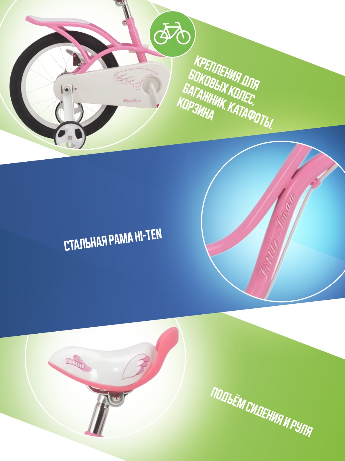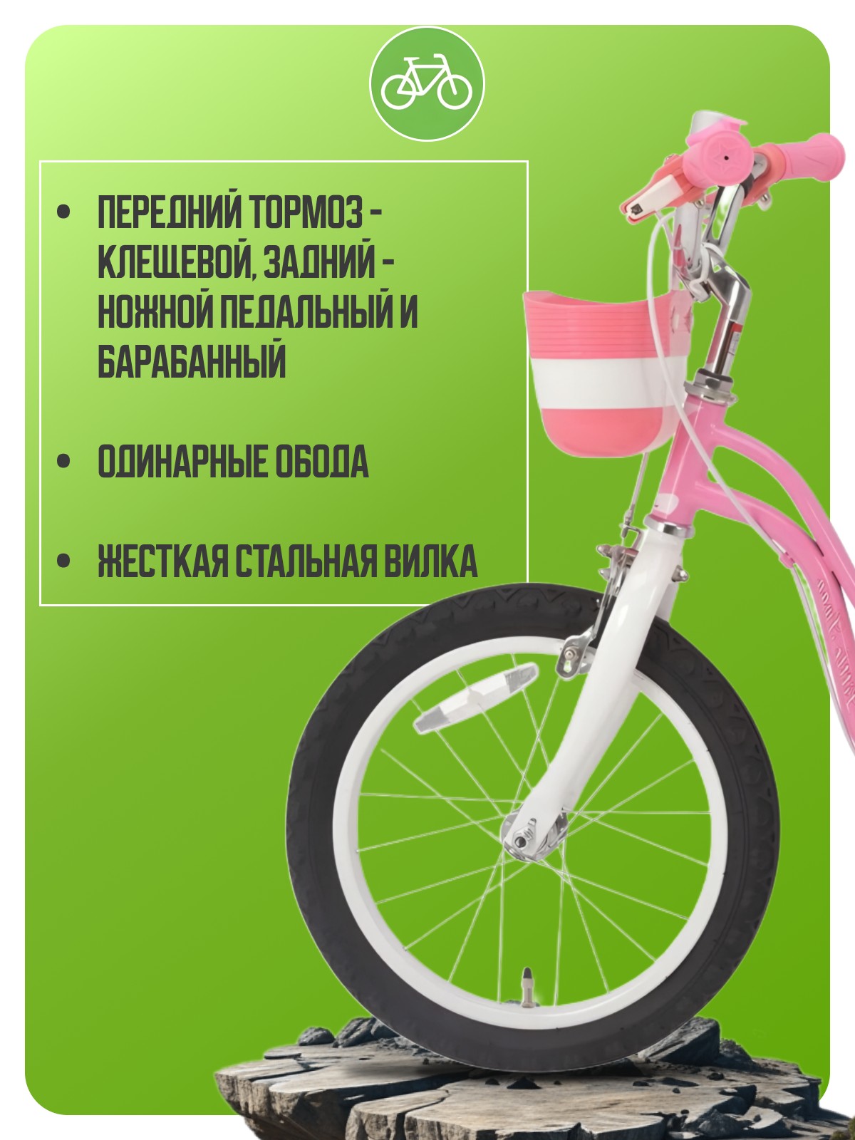 Велосипед, предназначенный для девочек в возрасте от трех до шести лет, без переключения передач. Технические особенности: стальная рама Hi-Ten, жесткая стальная вилка, одинарные обода, передний тормоз - клещевой, задний - ножной педальный и барабанный, полная защита цепи, съемные боковые колеса, багажник, передняя корзинка, звонок. Подходит для обучения и прогулочного катания в городских условиях. Диаметр колес - 16 дюймов. Вес - 11,3 кг.