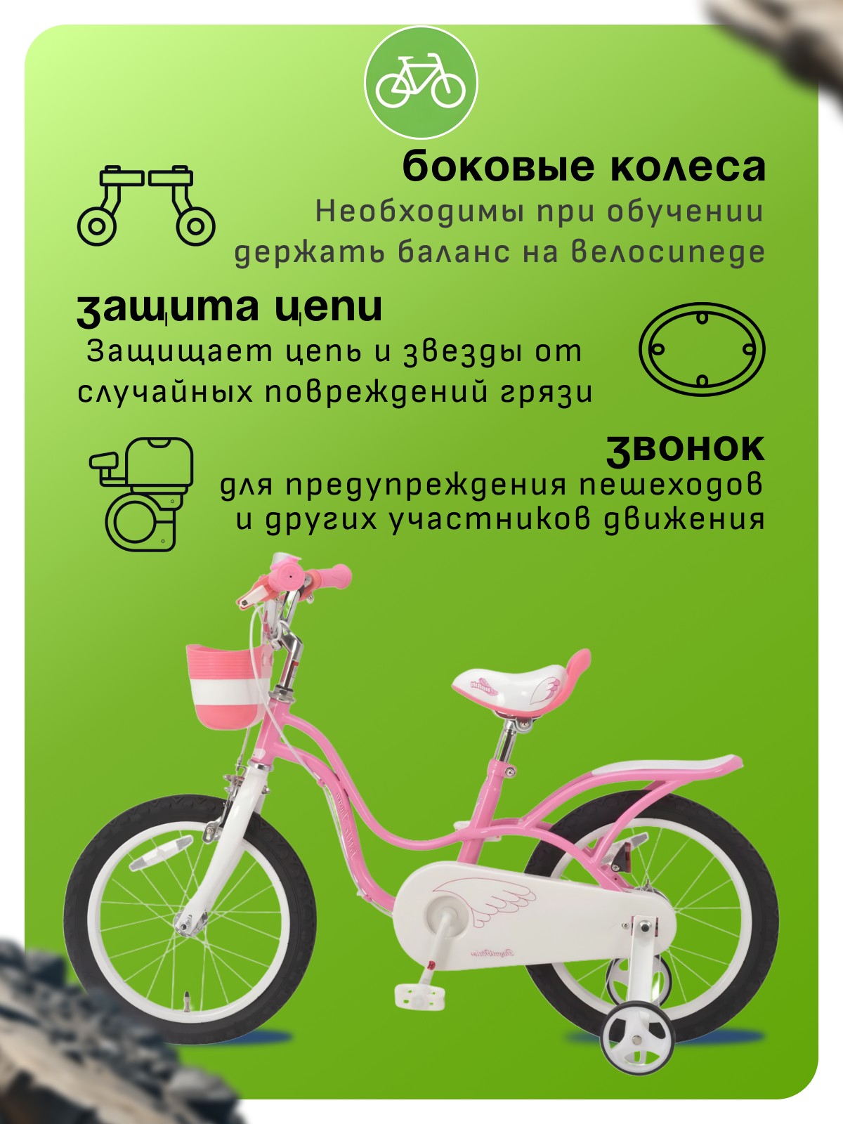 Особенности велосипеда: Багажник, Боковые колеса, Защита цепи, Звонок, Катафоты, Корзина, Крепления для боковых колес.