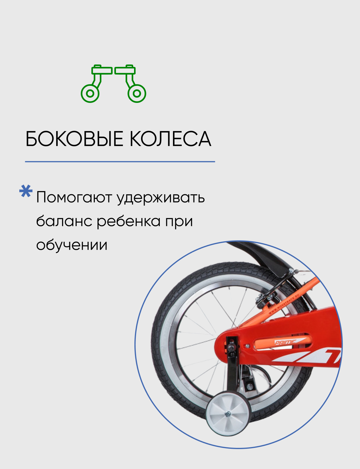 Алюминиевая рама, Боковые колеса, Защита цепи, Звонок, Катафоты, Крепления для боковых колес, Крылья