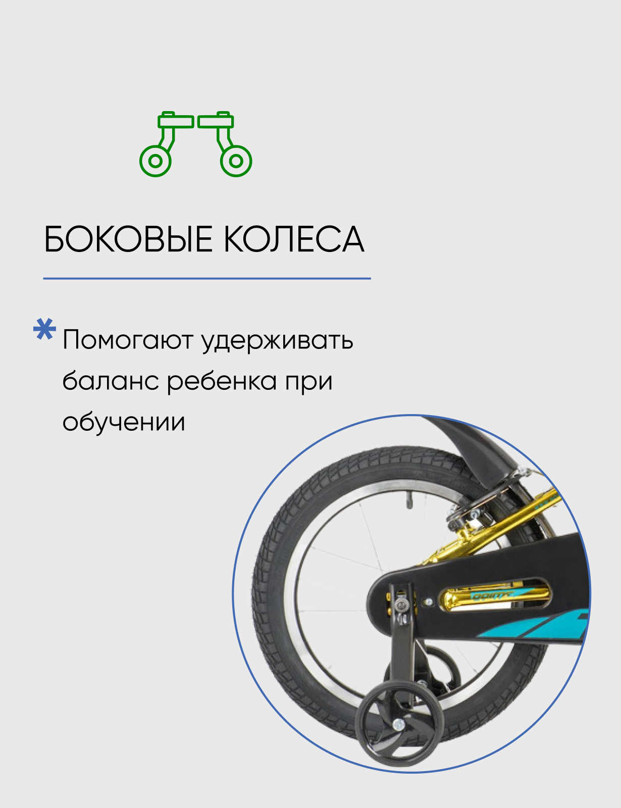 Алюминиевая рама, Боковые колеса, Защита цепи, Звонок, Катафоты, Крепления для боковых колес, Крылья