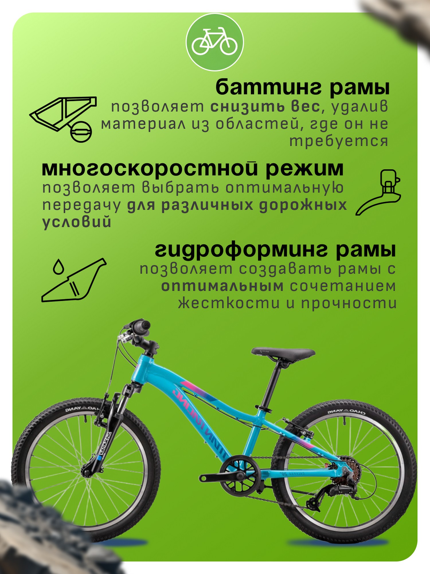 Алюминиевая рама, Амортизационная вилка, Баттинг рамы, Гидроформинг рамы, Многоскоростной, Подножка
